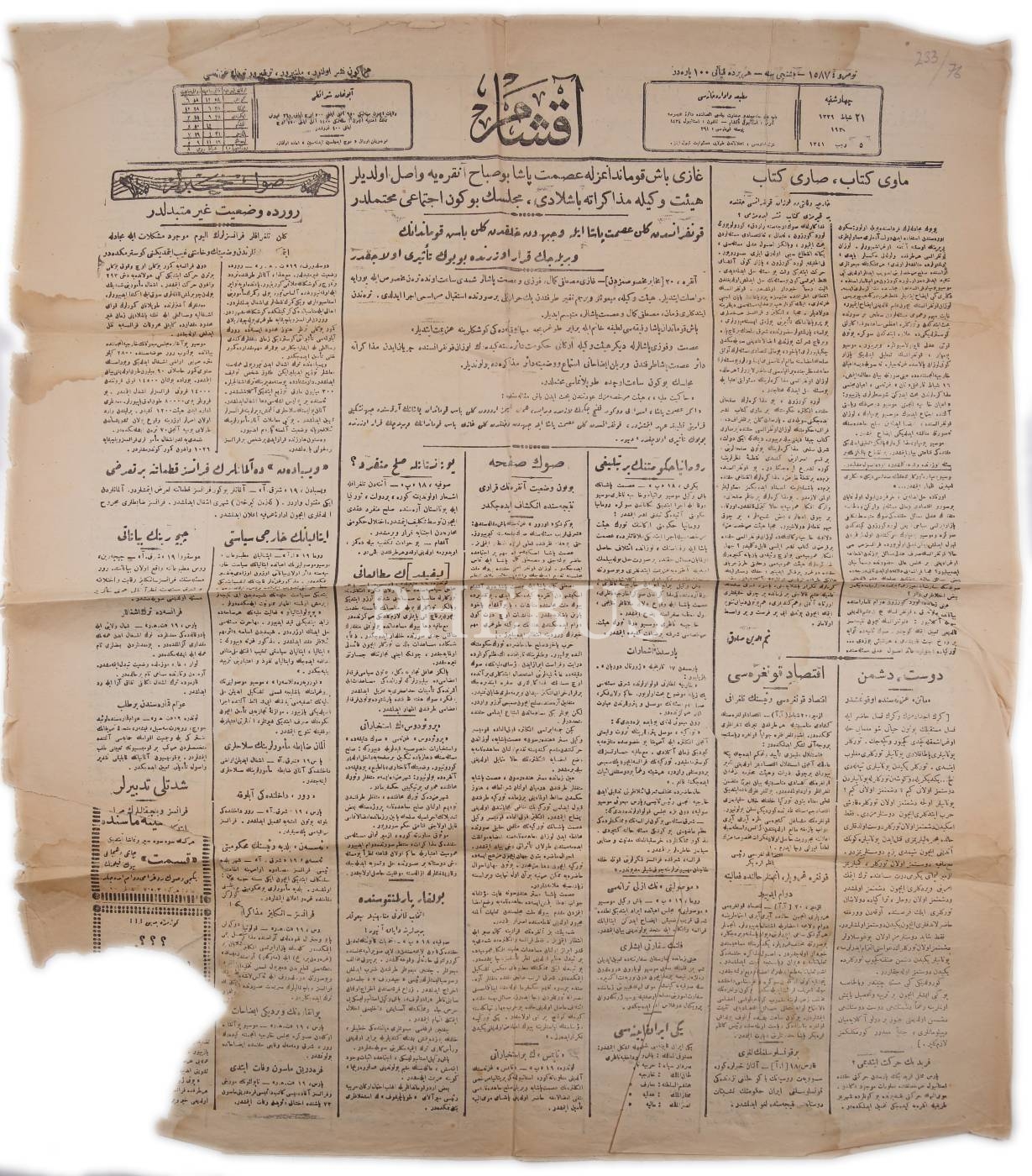 Osmanlıca Akşam Gazetesi, "Gazi Başkumandanımızla İsmet Paşa Sabah Ankara'ya Vasıl Oldular" Manşetli, 12 Şubat 1339 tarihli, 4 sayfa, 56x60 cm