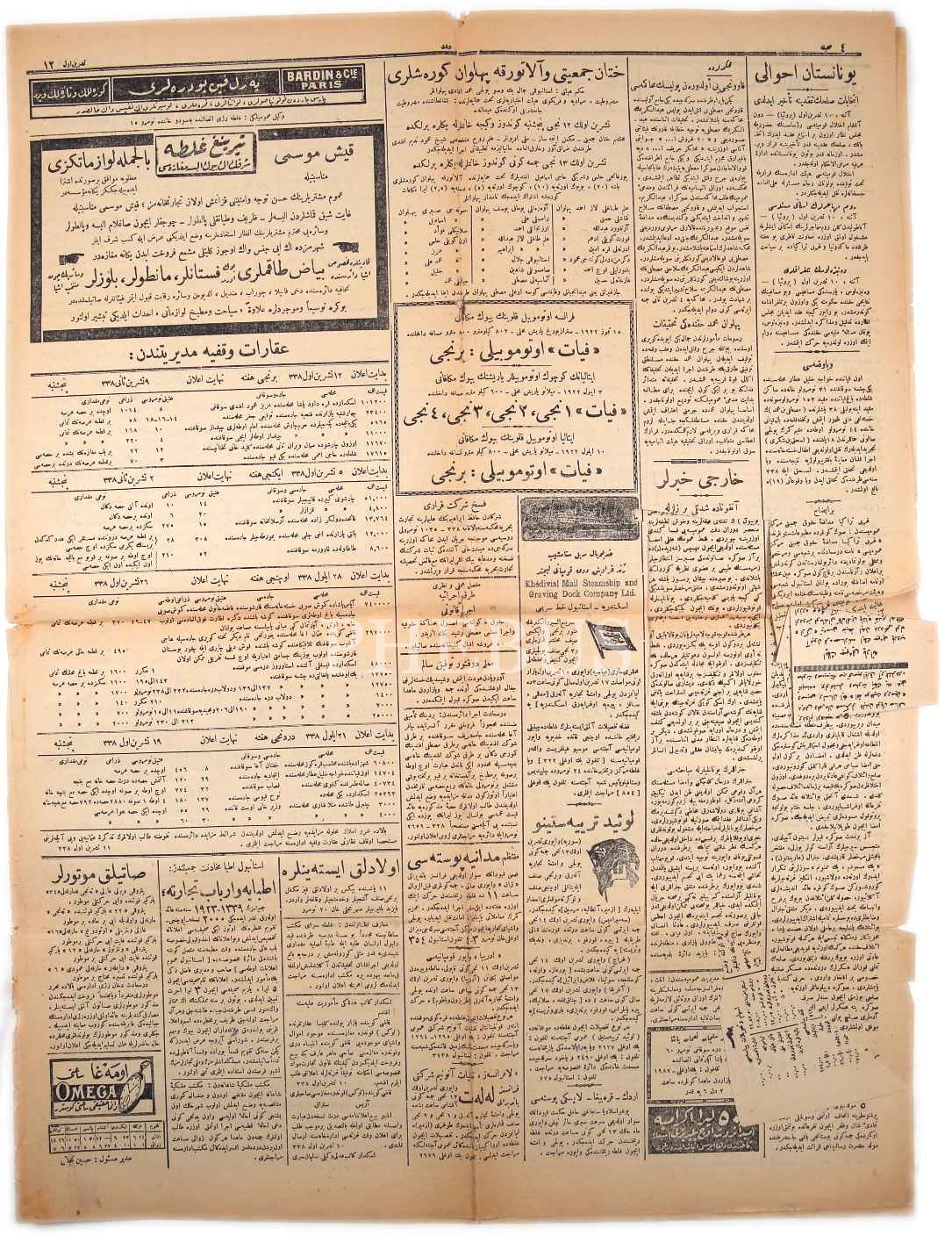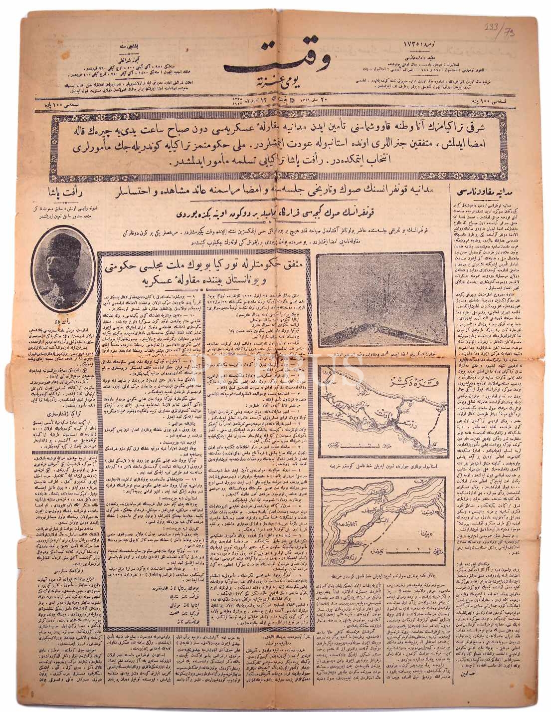 Osmanlıca Vakit Gazetesi, "Mudanya Konferansının Son ve Tarihi Celsesine ve İmza Merasimeine Aid Müşahede ve İhtisaslar", 4 sayfa, 48x62 cm