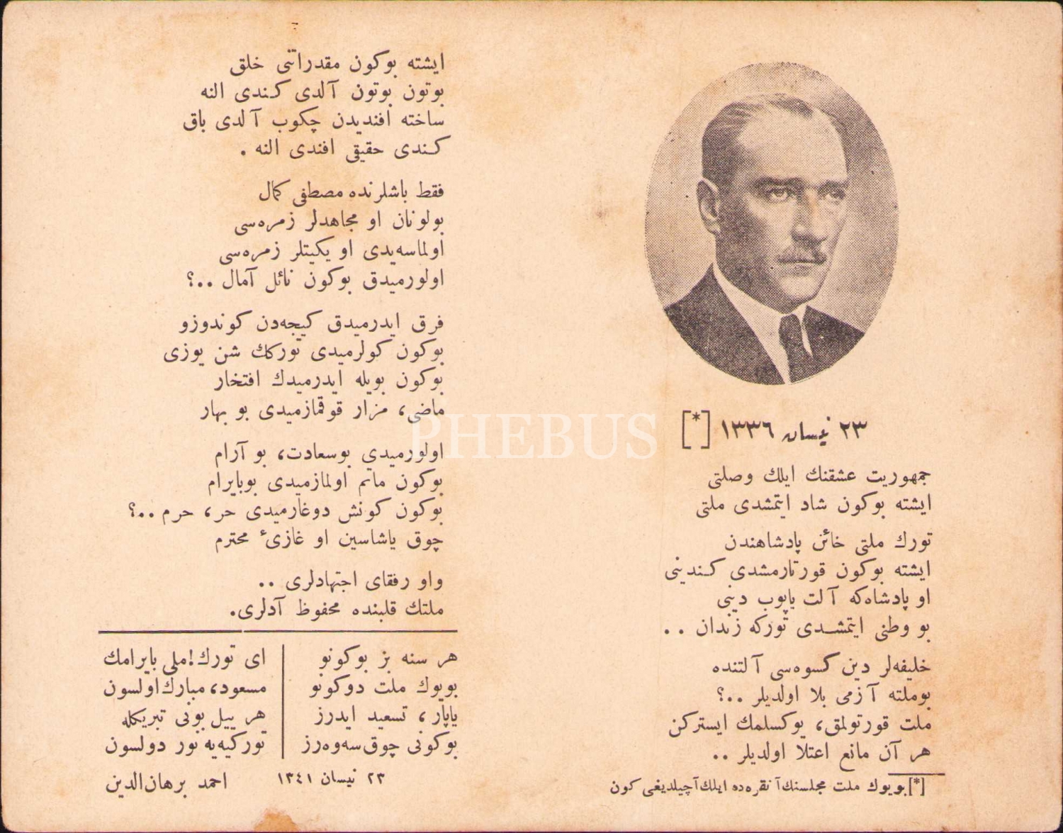 Mustafa Kemal Atatürk İçin Ahmed Burhaneddin tarafından yazılan şiir, "Türk milleti hâin pâdişâhdan/ İşte bugün kurtarmışdı kendini", 23 Nisan 1341 tarihli, "23 Nisan 1336" başlıklı, Büyük Millet Meclisinin Açılışı İçin Yazılmış, 17x13 cm