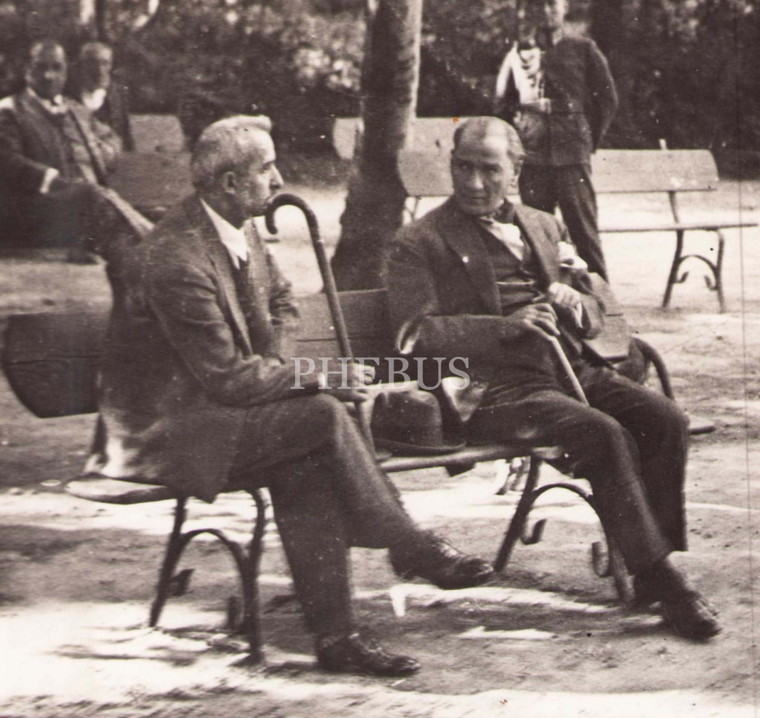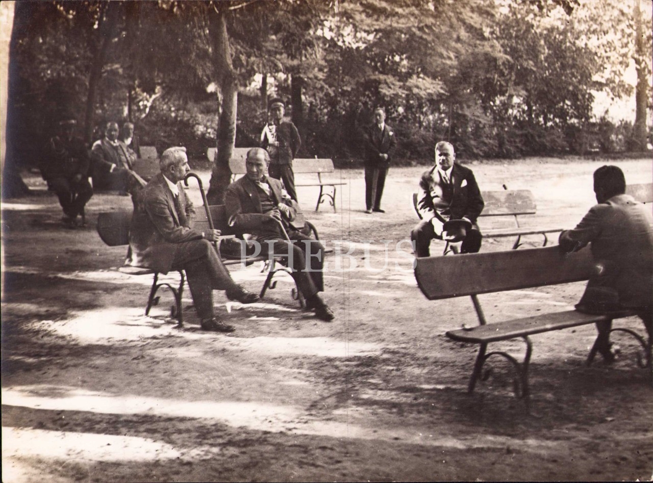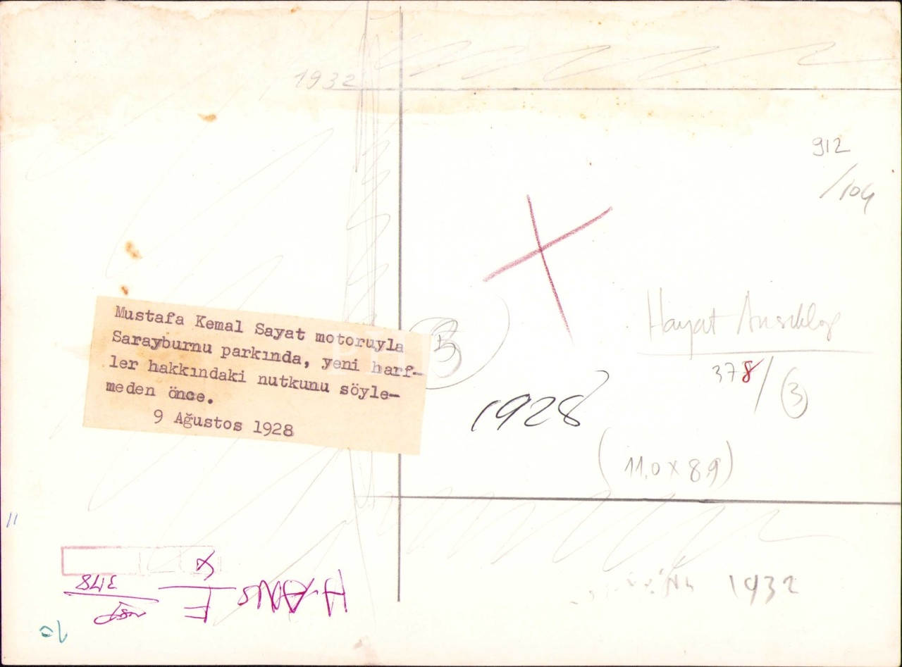 Mustafa Kemal Atatürk Sayat Motoruyla Sarayburnu Parkı'nda Yeni Harfler Hakkındaki Nutkunu Söylemeden Önce İsmet İnönü ve Kılıç Ali ile, 9 Ağustos 1928 tarihli