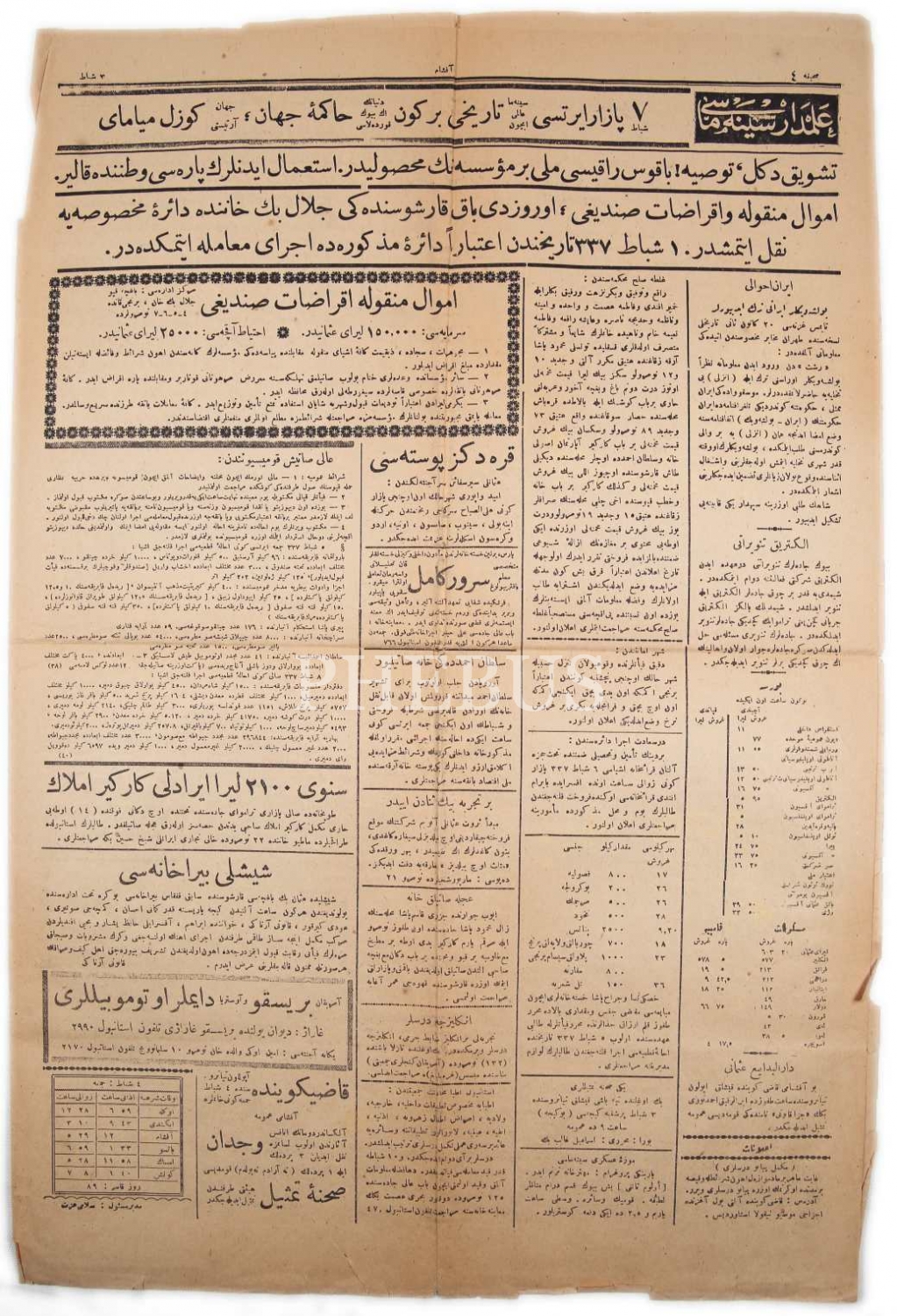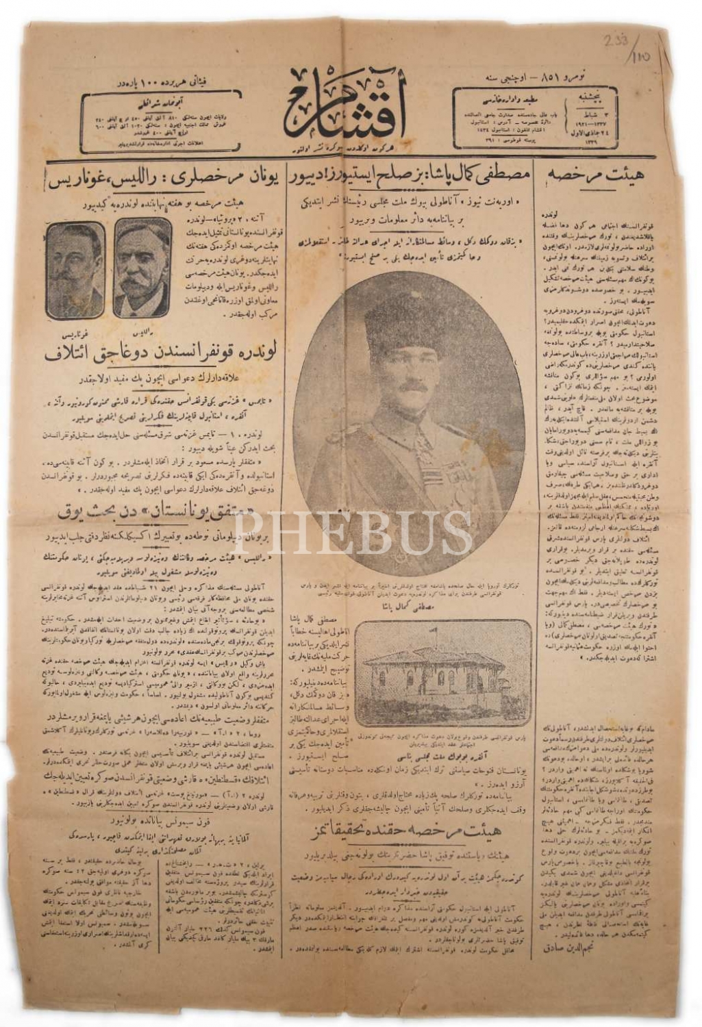 Osmanlıca Akşam Gazetesi, "Mustafa Kemal [Atatürk] Paşa: Biz Sulh İstiyoruz Diyor" Manşetli, 4 sayfa, 3 Şubat 1921 tarihli, 34x50 cm