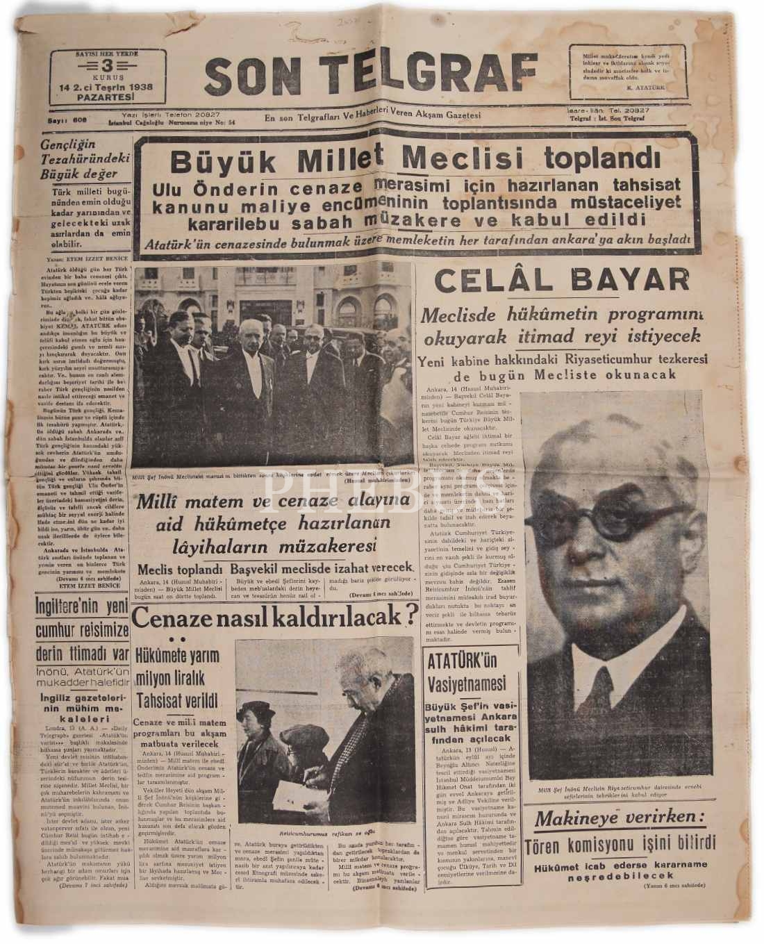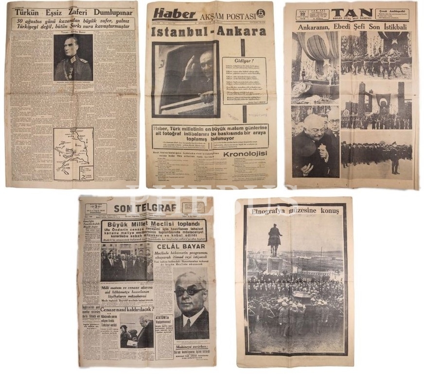 Mustafa Kemal Atatürk'ün Vefatı Sonrası Kasım 1938'de Yayınlanan 5 adet gazete, Akşam Postası, Tan, Son Telgraf Gazete, 30x60 cm