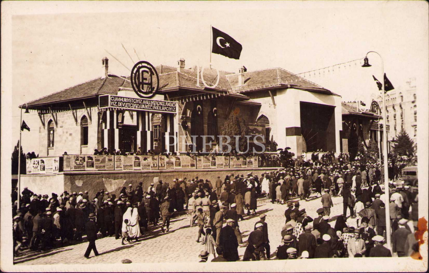 "Cumhuriyetçiyiz, Milliyetçiyiz, Halkçıyız, Devletçiyi, Laikiz, İnkılapçıyız" Tabelalı Cumhuriyetin Onuncu Yılı Kutlamaları Esnasında Ankara, 14x9 cm