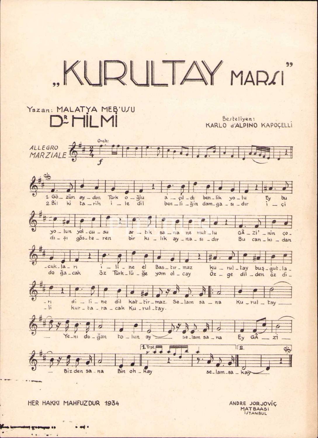 Kurultay Marşı, Yazan: Malatya Mebusu Doktor Hilmi Bey, Besteleyen: Karlo d'Alpino Kapoçelli, Andre Jorjoviç Matbaası, 1934 tarihli, 20x27 cm