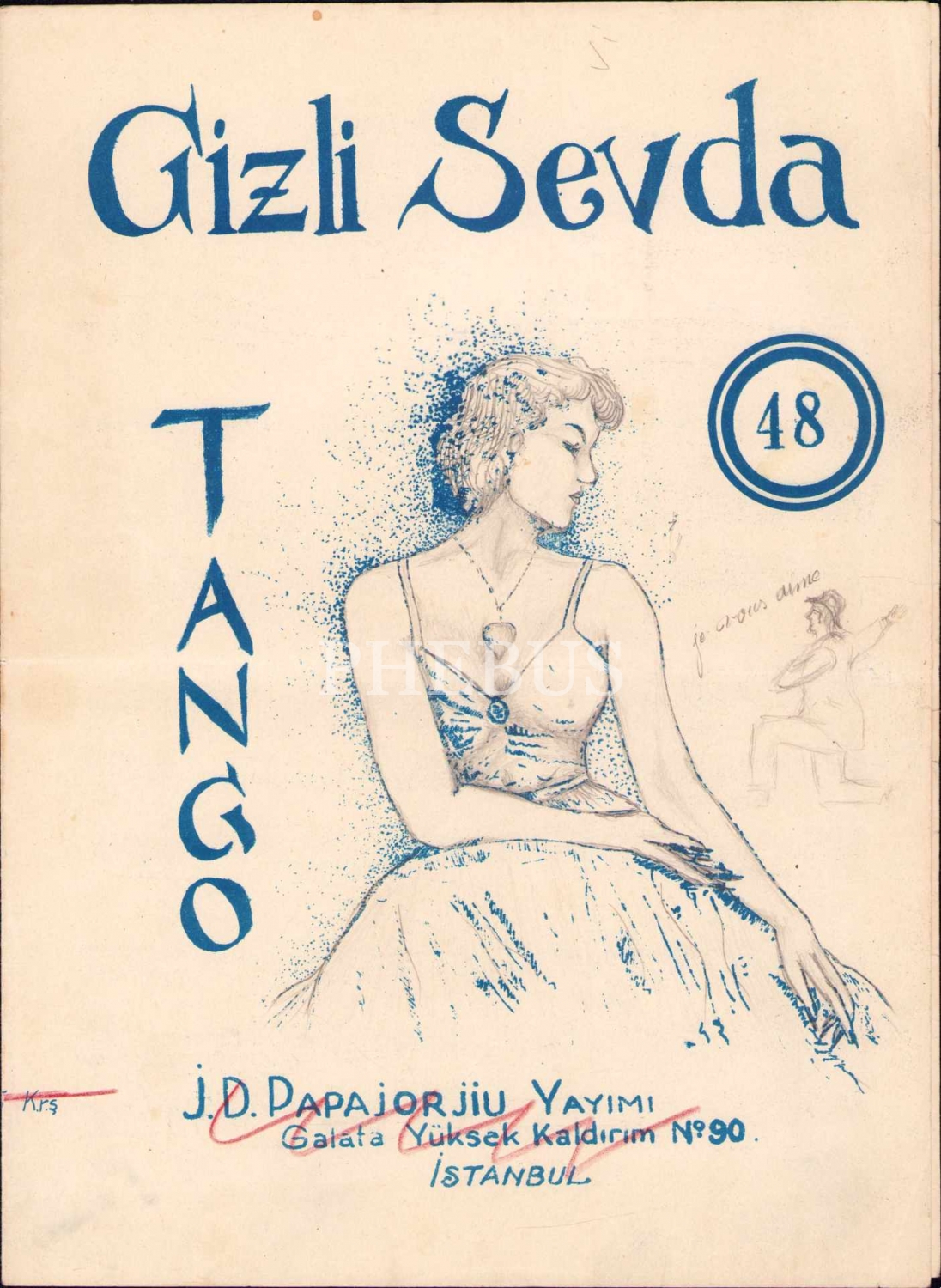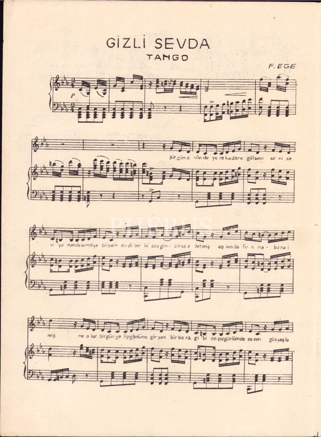 J. D. Papajorjiu Yayımı Matbu Nota, Gizli Sevda, Tango, F. Ege, Ege Yayımı damgalı, 2 varak, 25x35 cm