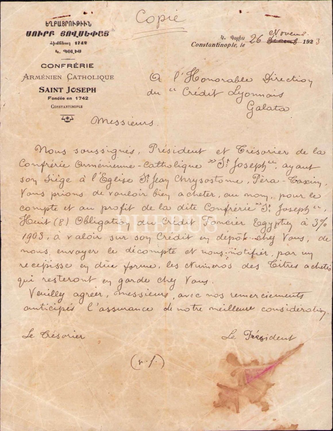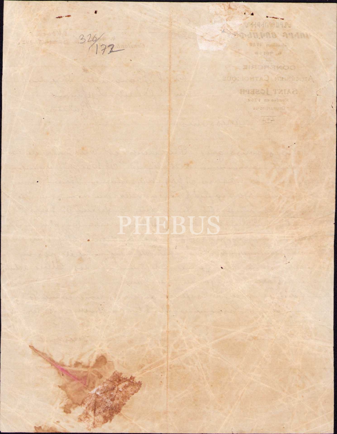 Ermeni Katolik Saint Joseph Lisesi antetli Fransızca Belge, 1923 tarihli, 21x26 cm