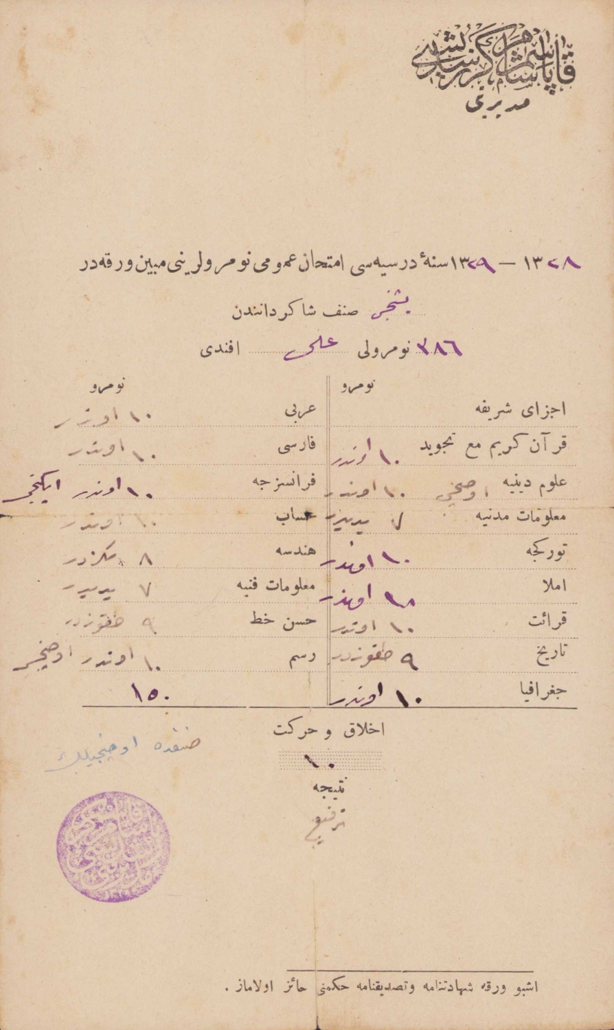 Osmanlı Kasımpaşa Merkez Rüştiyesi Müdüriyeti beşinci sınıf Ali Efendi isimli öğrenciye ait not çizelgesi, 1328,13x23cm