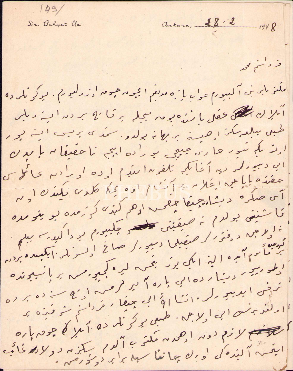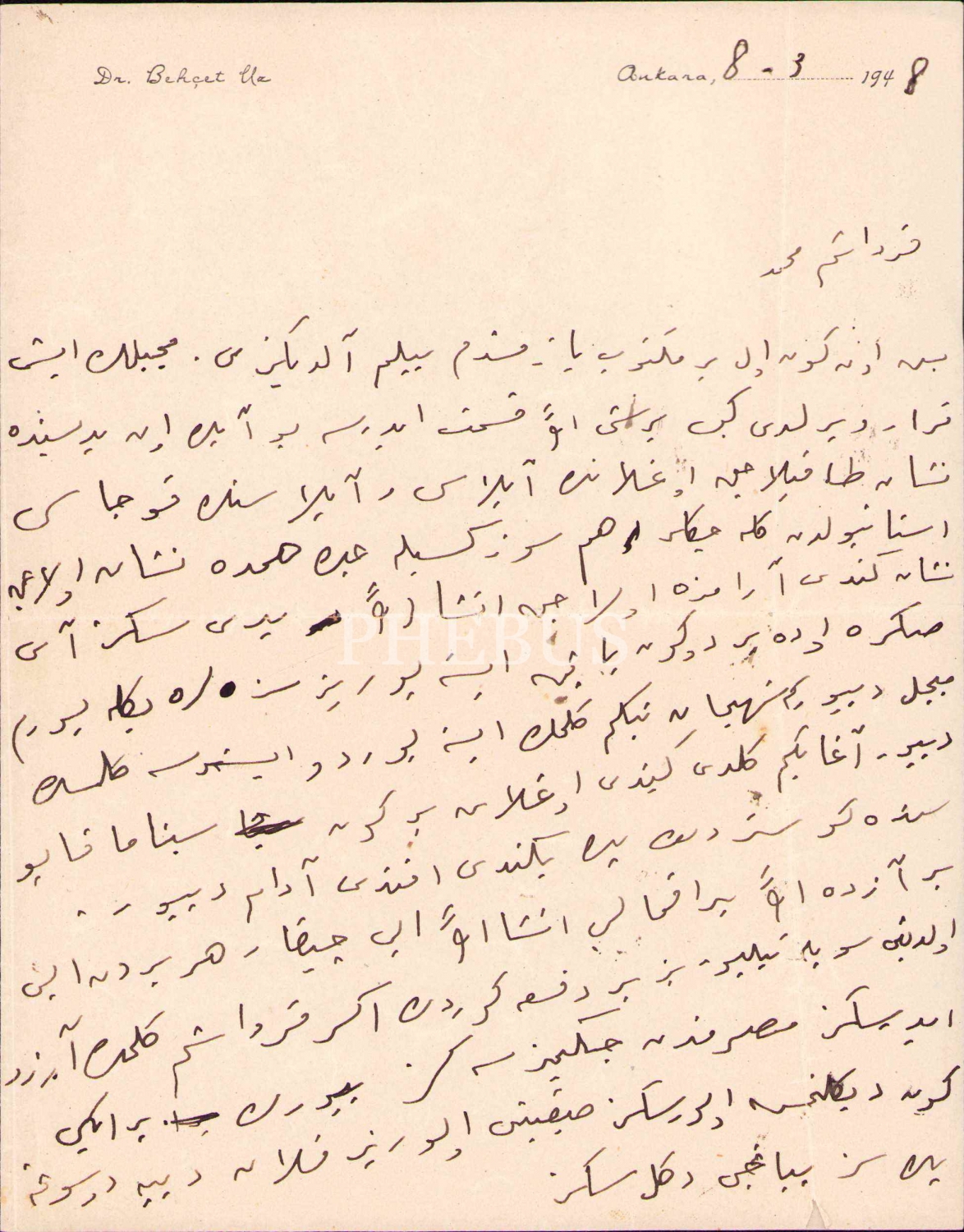 Behçet Hastalığına İsmini Veren Behçet Uz tarafından yazılmış Osmanlıca mektup, 1948 tarihli, 16x21 cm