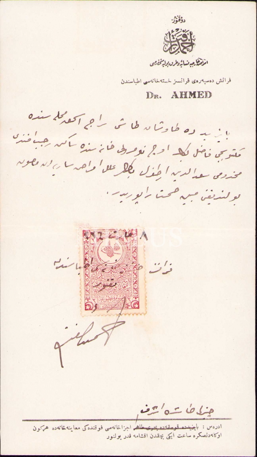 Osmanlıca Doktor Ahmed antetli hasta raporu, 1326 tarihli, 11x20 cm