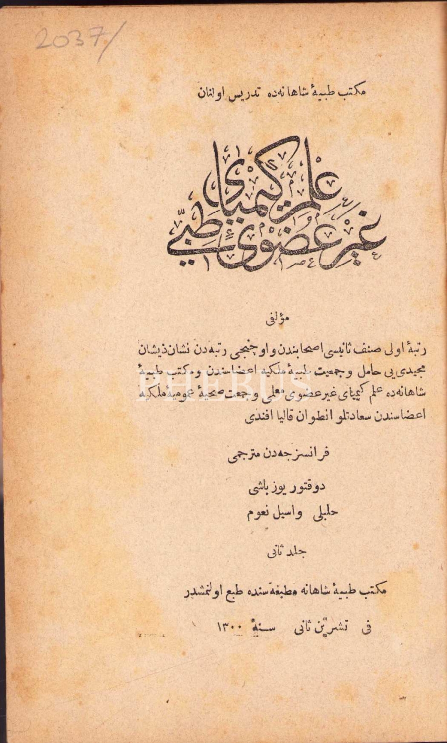 Mekteb-i Tıbbiye-yi Şahane'de Tedris Olunan "İlm-i Kimyâ-yı Gayr-ı Uzvi Tıbbı", Müellifi: Anton Kalya Efendi, Fransızcadan Mütercimi: Halepli Vasil Naum, Mekteb-i Tıbbiye-yi Şahane Matbaası, 615 sayfa, 15x20 cm
