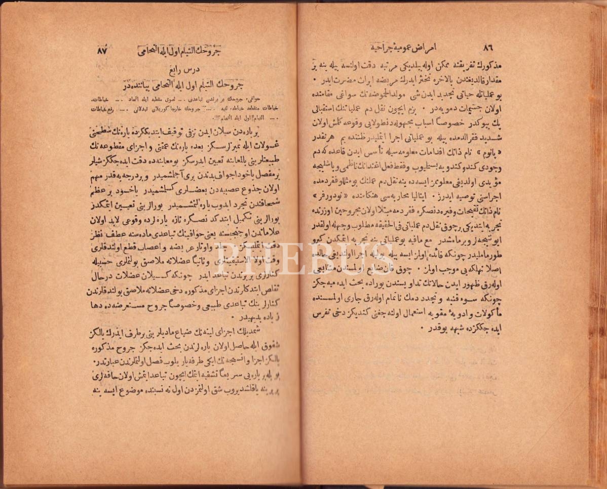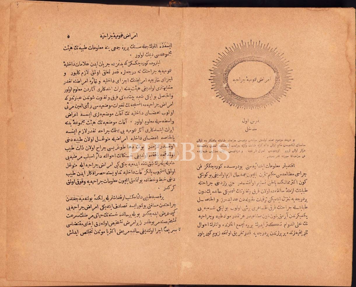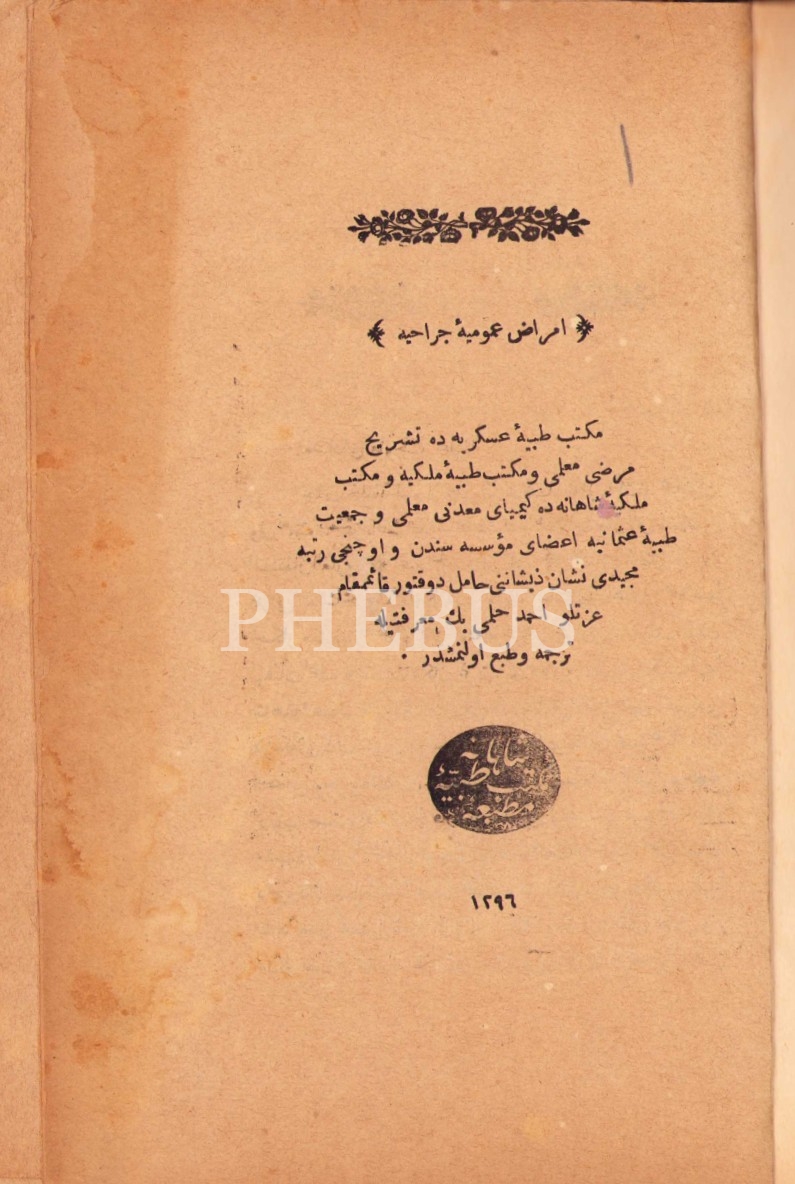 Osmanlıca Emraz-ı Umumiye-i Cerrahiye [Genel Cerrahi Hastalıklar], Ahmed Hilmi Bey, Mekteb-i Tıbbiye-yi Şahane Matbaası, 1296 tarihli, künyede yırtık mevcut, 1216 sayfa, 15x23 cm