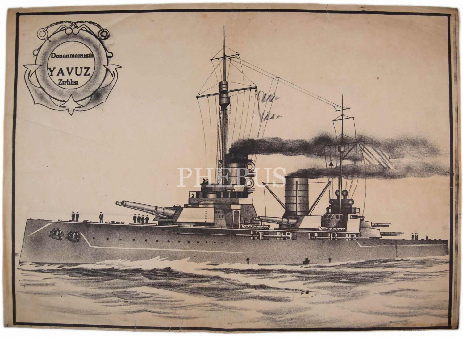 Osmanlı'nın Birinci Cihan Harbi'ne Girmesine Yol Açan Yavuz Zırhlısı Afişi, "Donanmanın Yavuz Zırlısı" Yazılı Afiş, 57x41 cm