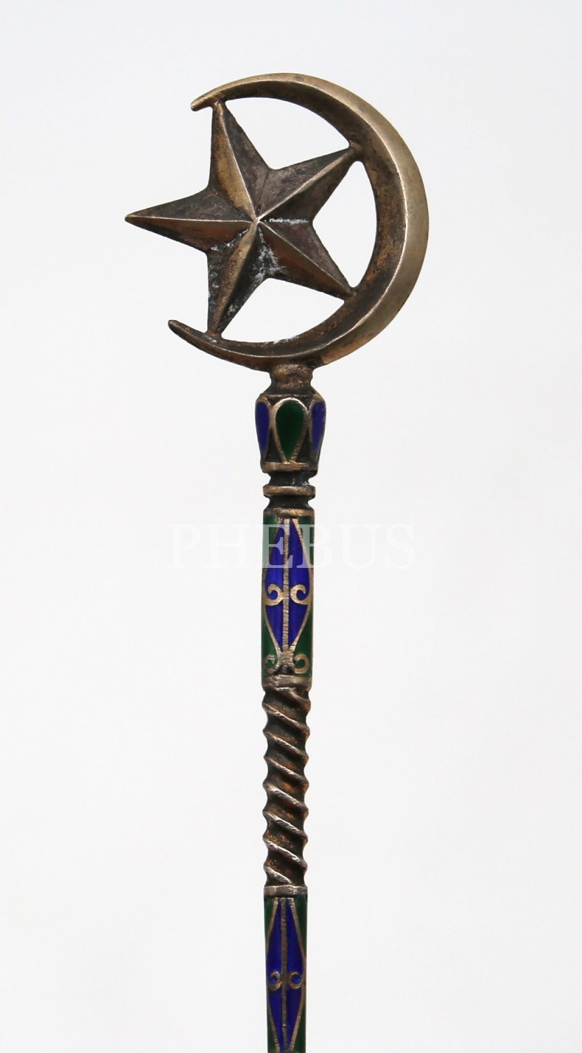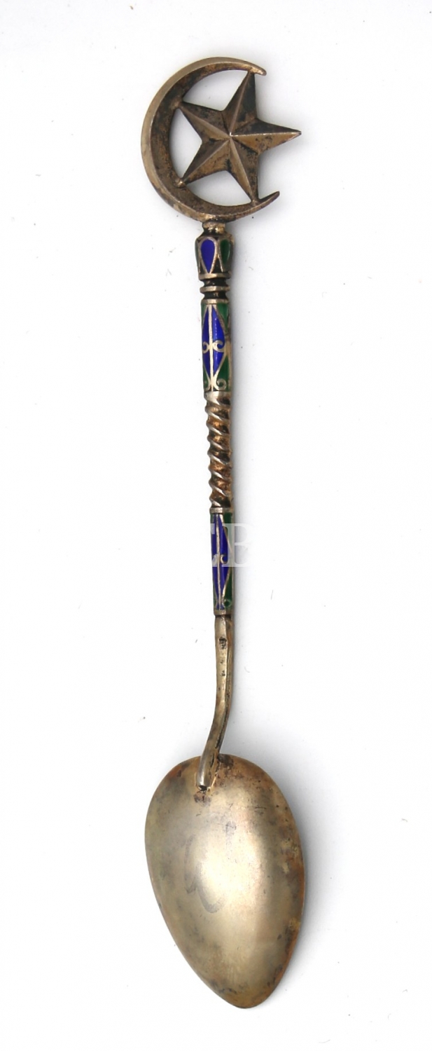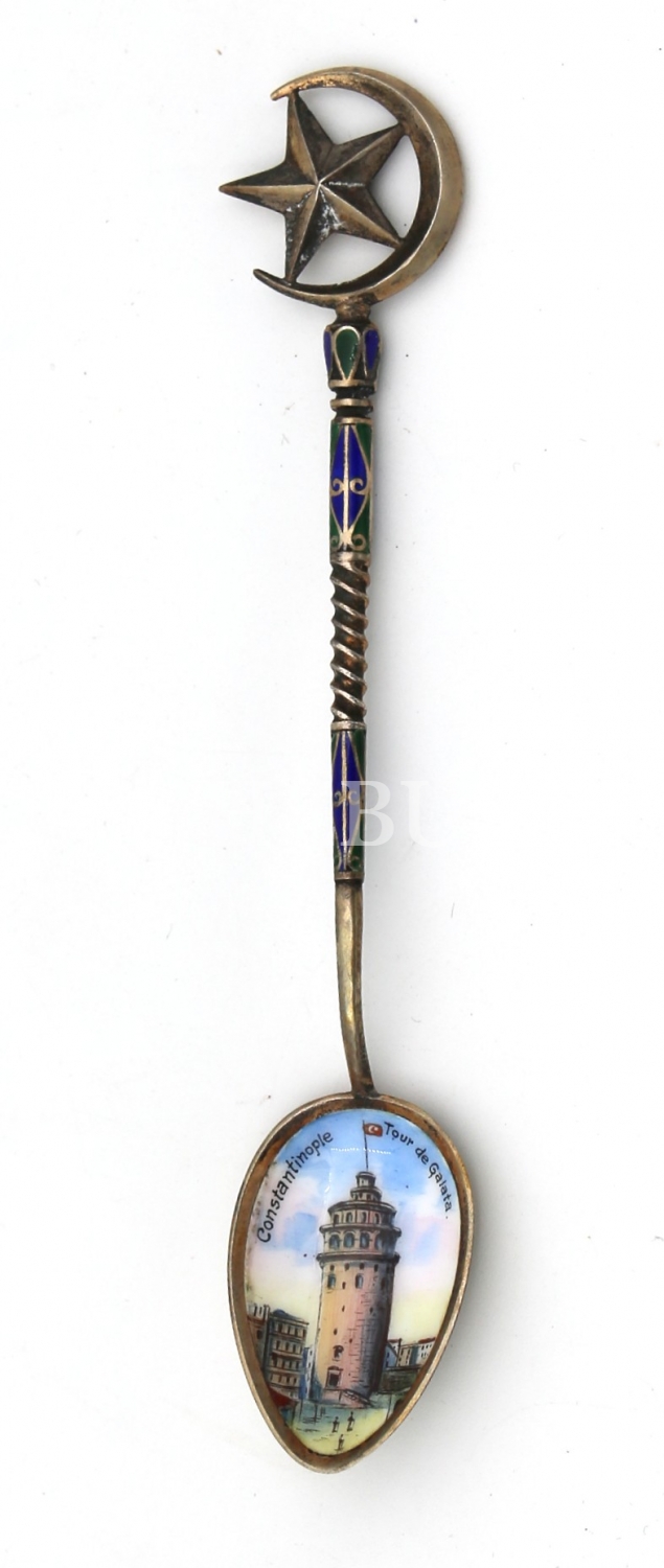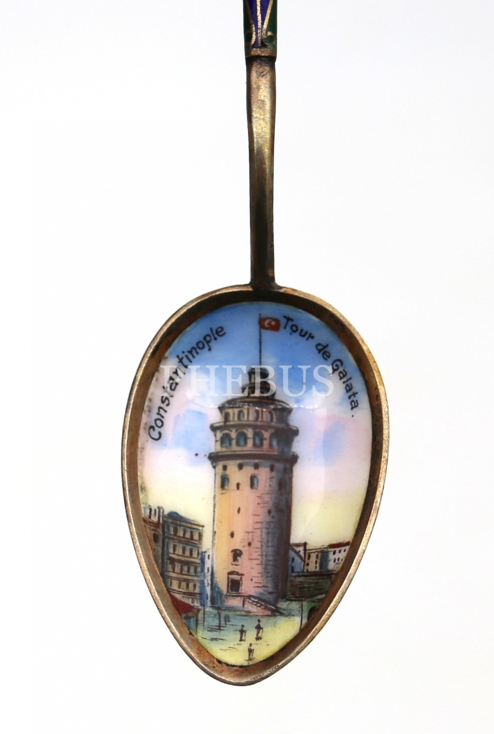 Constantinople Galata Kulesi tasvirli, ucu ay-yıldızlı gümüş kaşık, 14x2 cm