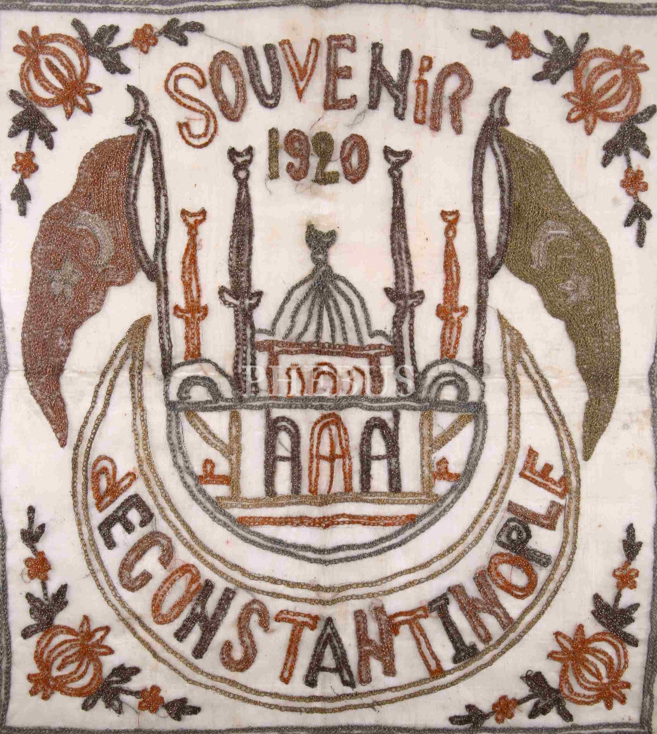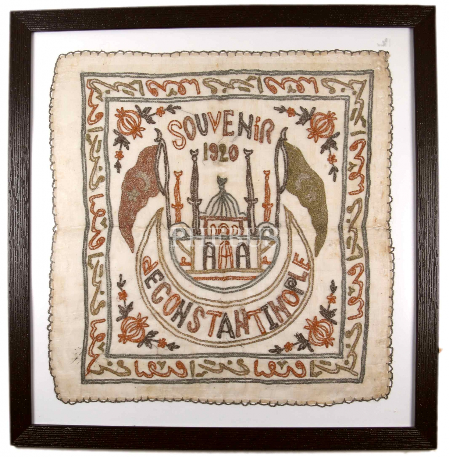 "Souvenir de Constantinople 1920 [İstanbul Hatırası]" yazılı hatıra mendili, 45x45 cm