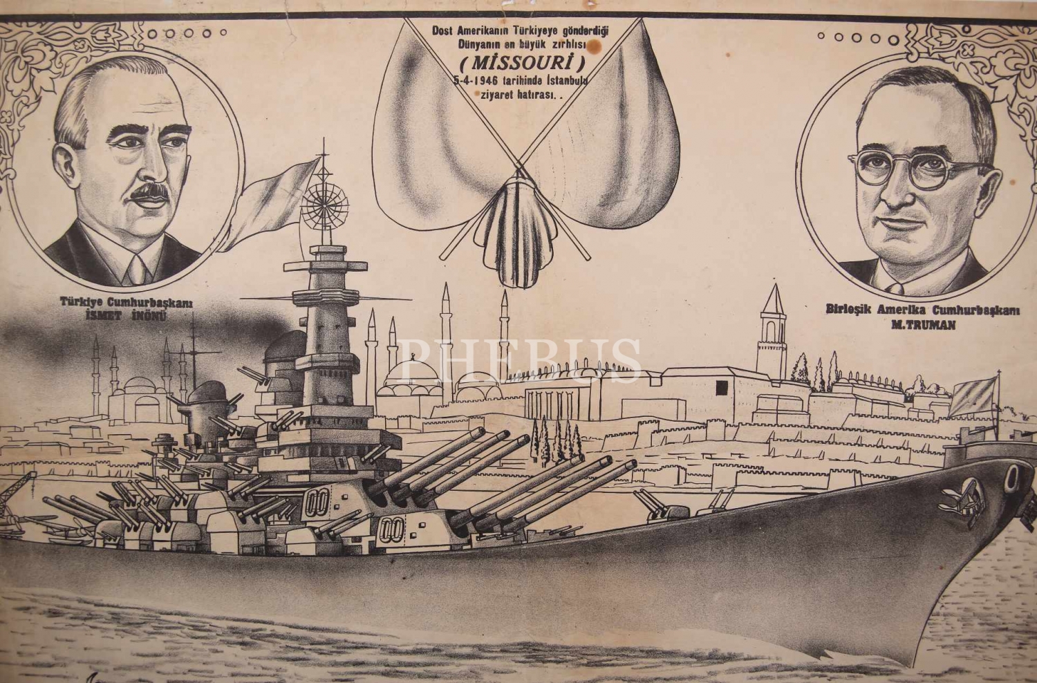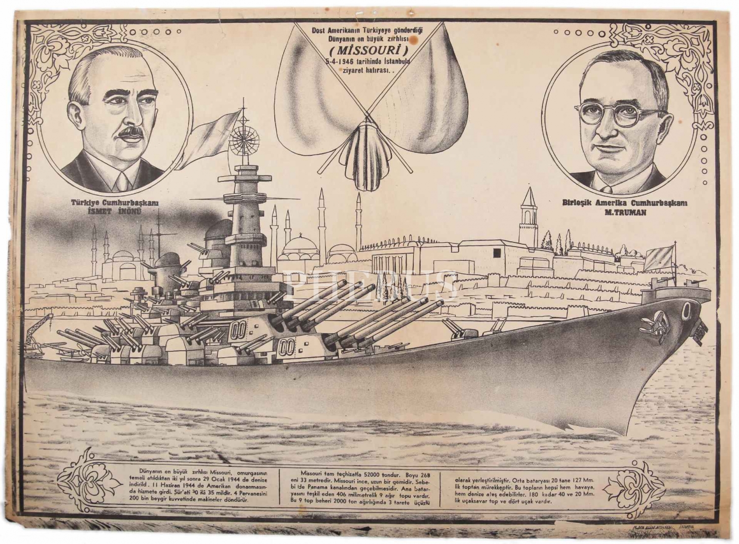 Amerika'nın Türkiye'ye Gönderdiği Dünyanın En Büyük Zırhlısı Missouri Afiş, 5-4-1946 tarihinde İstanbul'u Ziyaret Hatırası, İsmet İnönü ve Truman görselli, 57x42 cm