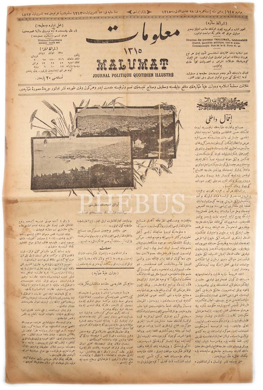Malumat Gazetesi, Mehmed Fuad ile Artin Asaduryan’ın birlikte 48 sayı çıkarıp kapattıktan sonra Mehmet Tahir tarafından alınarak devam ettirilen ve yayın hayatının birinci yılından sonra Servet-i Fünun topluluğunu birleştirecek hareketler yaratan dergidir. 1894 tarihinde yayın hayatına başlamıştır. Muallim Feyzî, Hüseyin Dâniş ve Müstecabîzâde İsmet Bey gibi eski tarzda şiirler yazan şairlerin yanı sıra, başta Tevfik Fikret olmak üzere İsmail Safâ, Süleyman Nazif, Hüseyin Sîret, Abdullah Cevdet gibi genç isimler de yer almaktaydı. Malumat, devrin diğer mecmualarından farklı olarak resim ve fotoğrafa bolca yer vermekte idi. Bu özelliği dolayısıyla “Musavver Malûmat” adıyla da tanınacaktı. Derginin görselleri, dönemin ünlü ressamları ve fotoğrafçıları sayılan Abdullah Efendi ve Ressam Vefiyadis tarafından hazırlanmış olup dönemin paşaları, kasaba, şehir, rıhtım, iskele, okul, cami, gemi, savaş topları bazen tarihi mekânlar bazen de şehirlerde yer alan önemli devlet dairelerinin diğer unsurlar ile ilgili birçok fotoğraf bulunmaktadır. Fotoğrafın kime ya da nereye ait olduğu, fotoğrafın hemen altında Türkçe, Arapça ve Fransızca olarak açıklanmıştır.