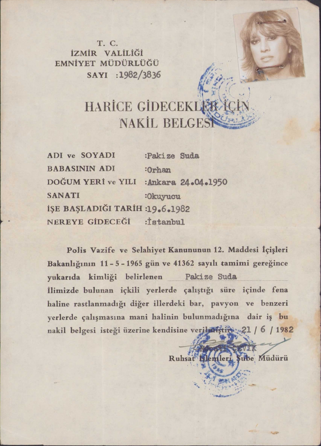İzmir Valiliği Emniyet Müdürlüğü antetli, Harice Gidecekler İçin Nakil Belgesi, 1982 tarihli, fotoğraflı, mühürlü, 14x20cm