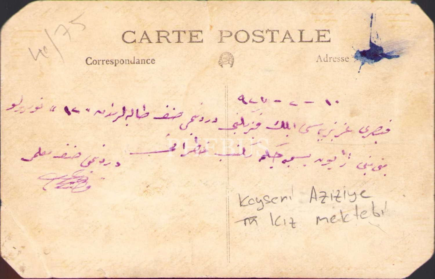 Arkasında Osmanlıca olarak Kayseri Aziziye Kız Mektebi olduğu belirtilmiştir.