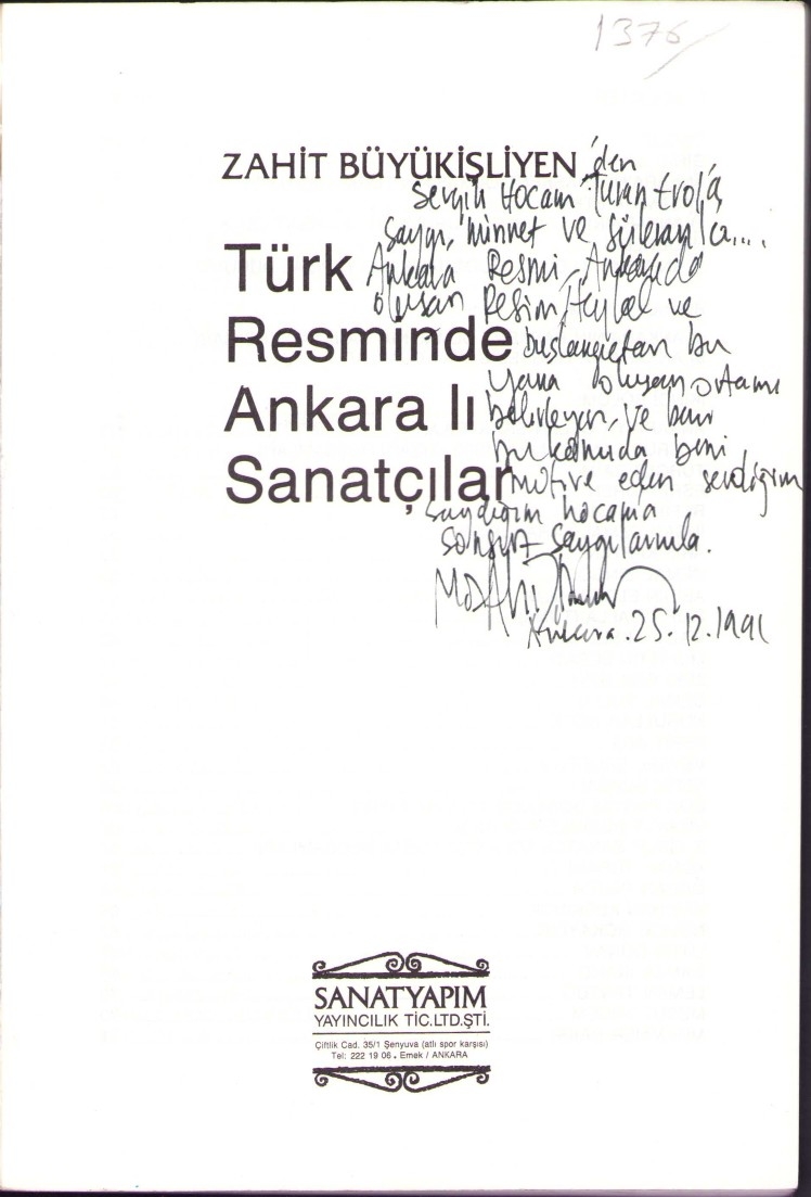 Zahit Büyükişliyen'den Ressam Turan Erol'a İthaflı ve İmzalı ''Türk Resminde Ankaralı Sanatçılar'', Sanatyapım Yayıncılık, 136 sayfa, 16x24 cm
