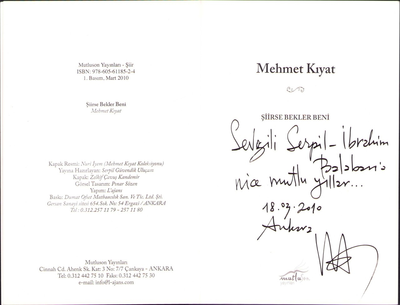 Mehmet Kıyat'tan İthaflı ve İmzalı ''Şiirse Bekler Beni'', Mutluson Yayınları, 1. Baskı: Mart 2010