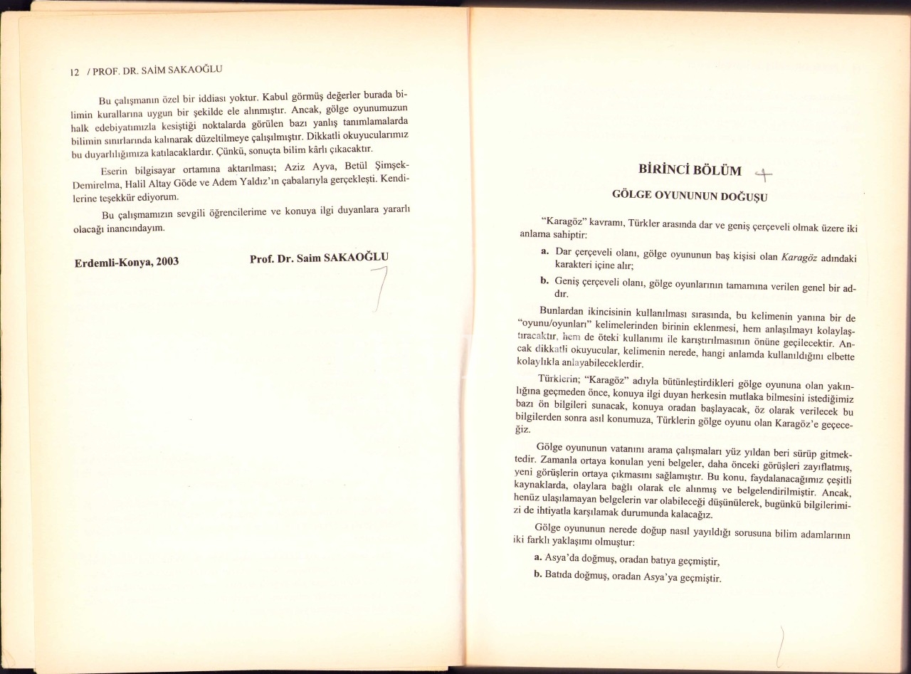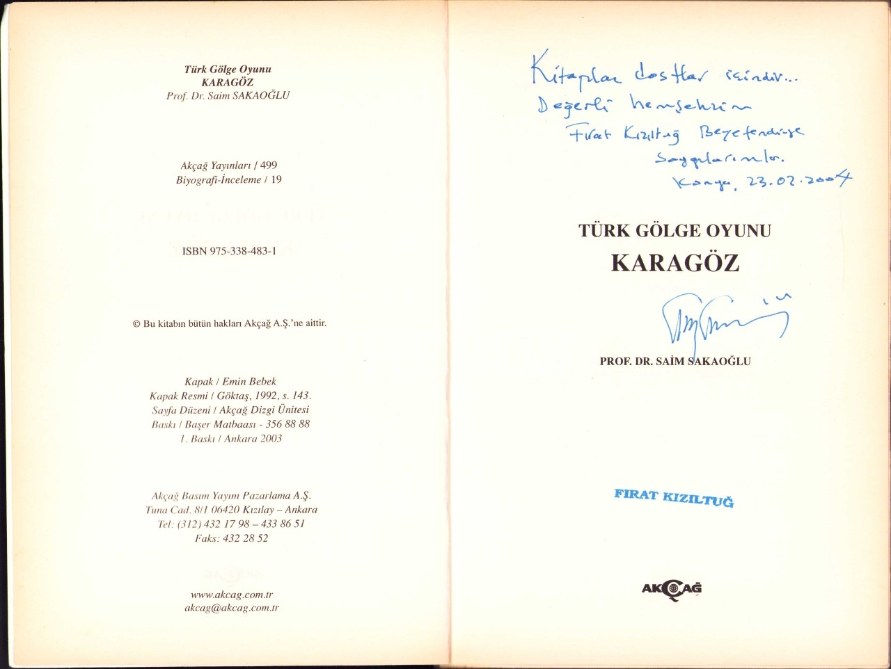 Prof. Dr. Saim Sakaoğlu'ndan İthaflı ve İmzalı ''Türk Gölge Oyunu Karagöz'', Akçağ Yayınları, 1. Baskı: Ankara 2013, 326 sayfa, 16x24 cm