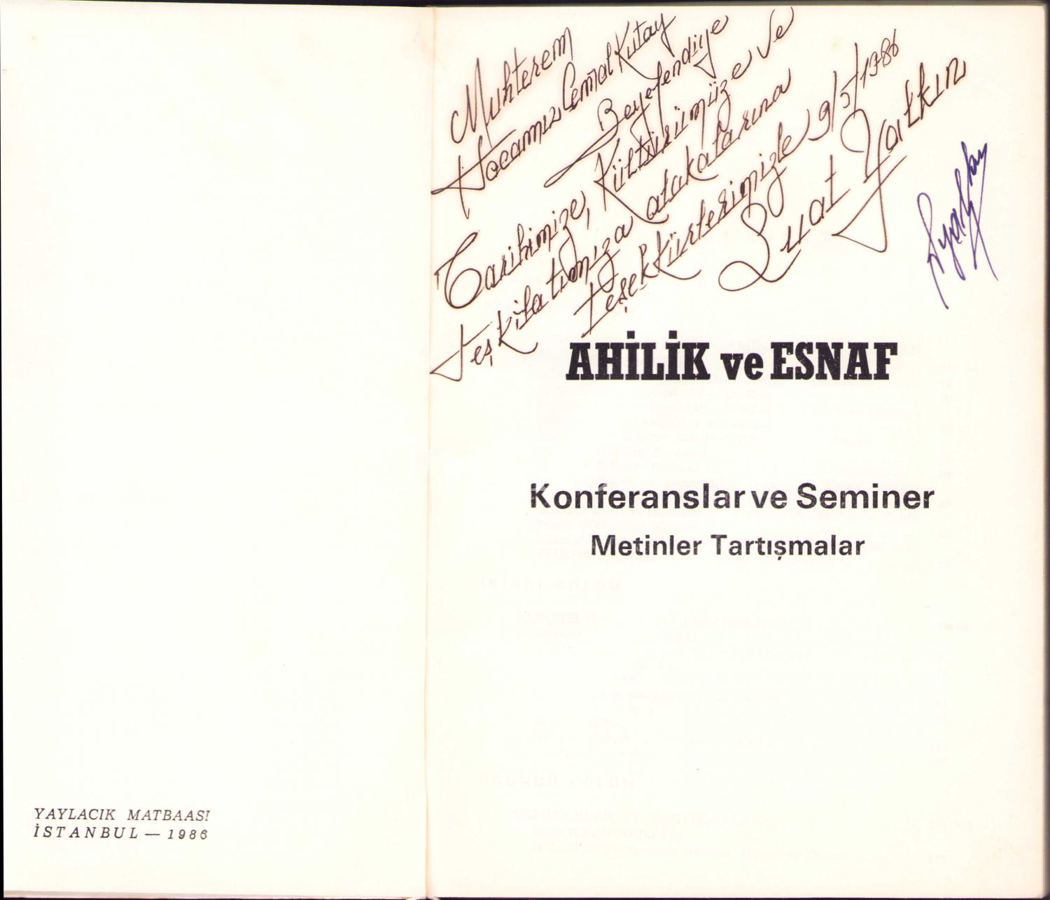 Suat Yalkın'dan Cemal Kutay'a İthaflı ve İmzalı ''Ahilik ve Esnaf'', İstanbul Esnaf ve Sanatkarlar Dernekleri Yayınları: 1, 1986, 203 sayfa, 16x23 cm