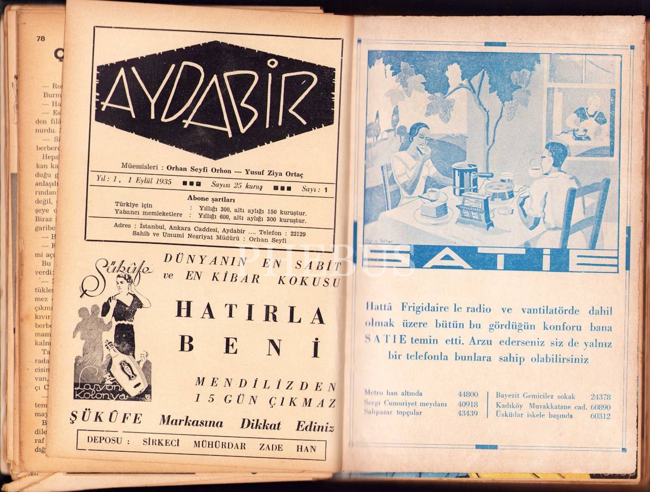 Aydabir dergisi cildi, cilt 1, sayı 1-6 arası, 17x24 cm, bazı sayfalarda yırtık mevcut, haliyle