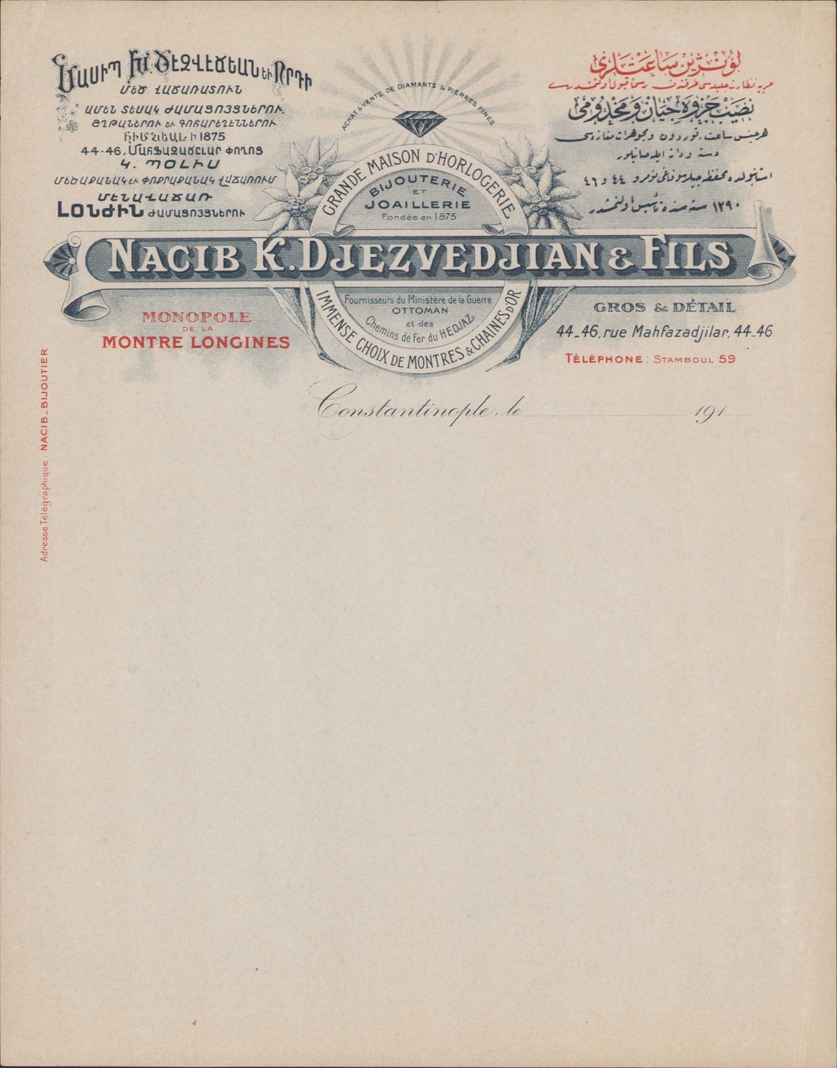 Ünlü Longines saatleri tüccarı Ermeni Nacib Djezvedjian & Fils antetli kağıt, Osmanlıca, Ermenice - Fransızca üç dilde yazılı, 21x27cm