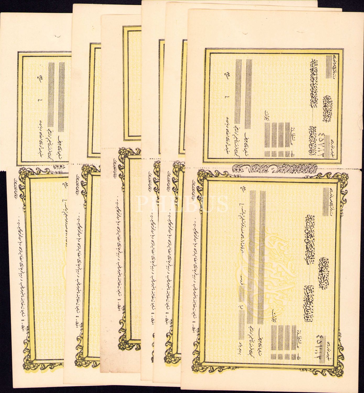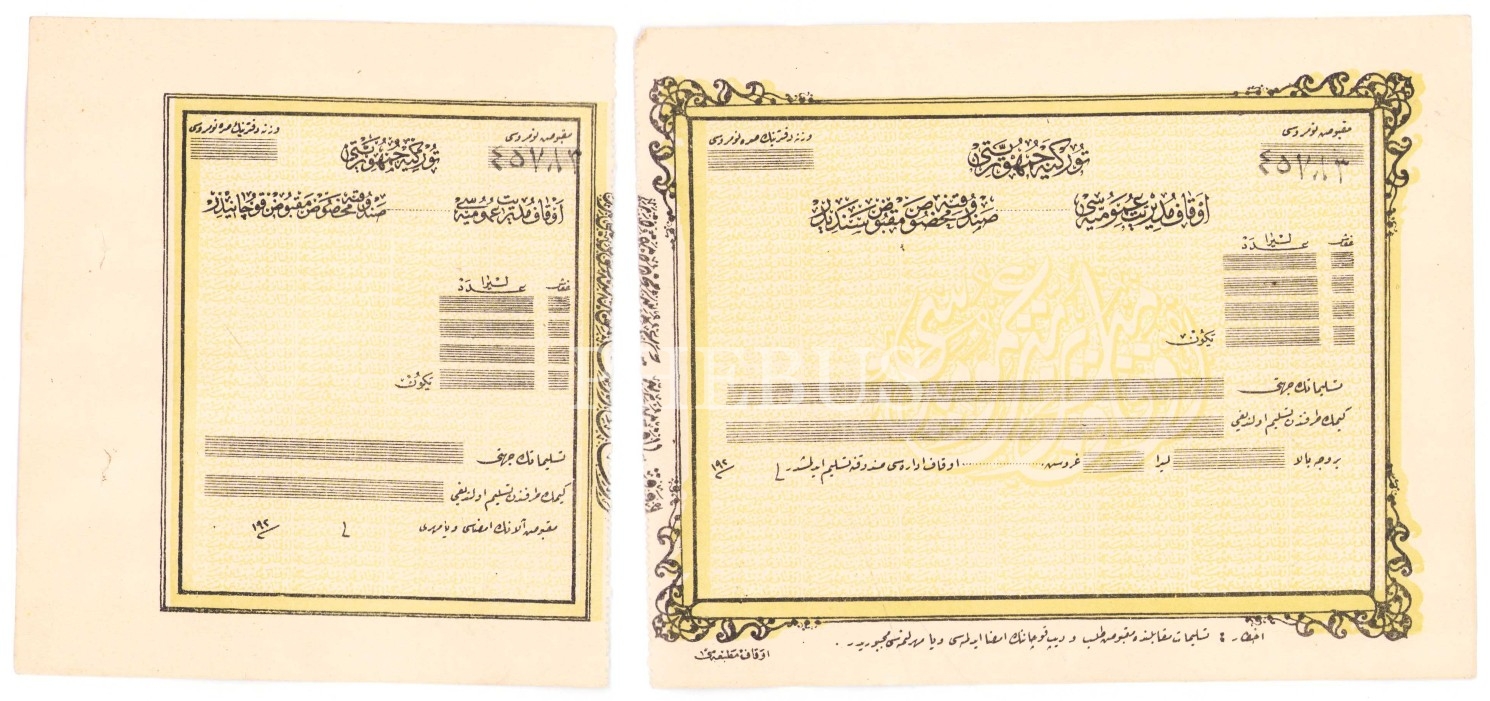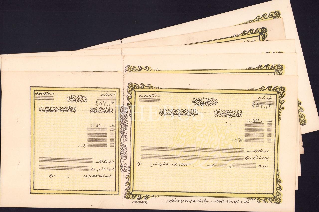 6 adet Osmanlıca Evkâf Müdiriyyet-i Umûmiyyesi boş makbuz, makbuzlardan birkaçı ayrık vaziyettedir, 15x31 cm