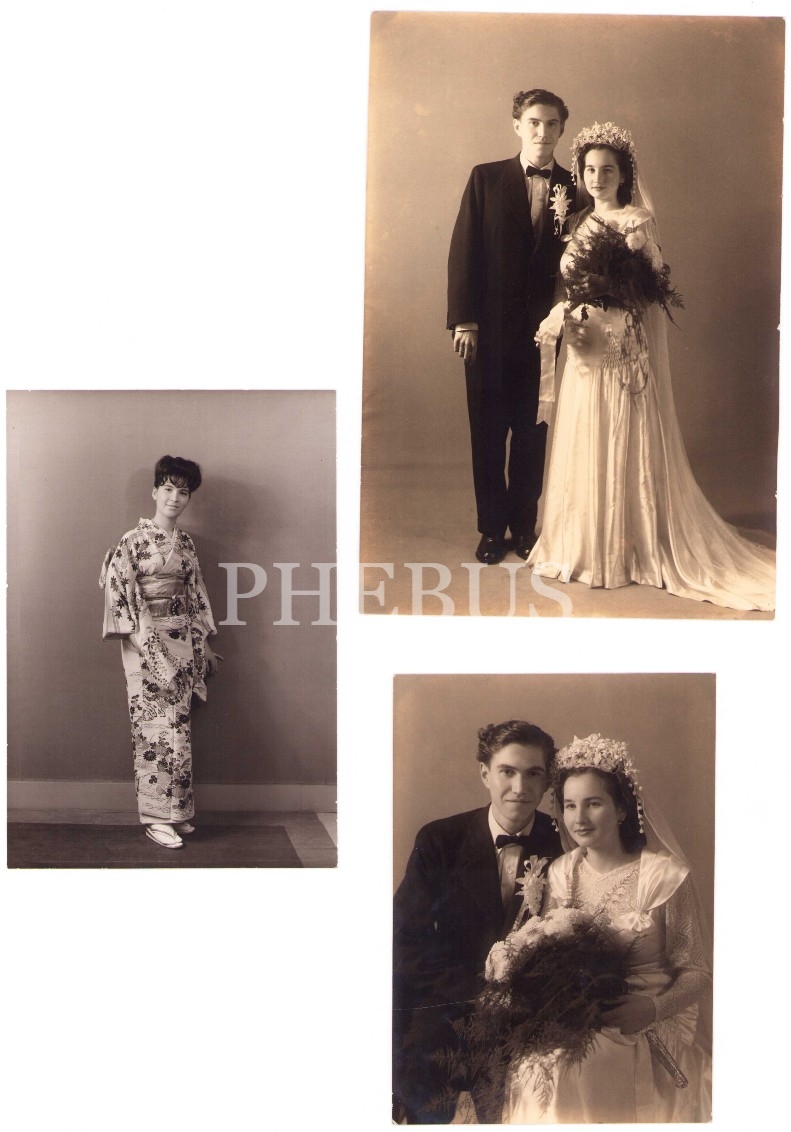 3 adet fotoğraf [düğün fotoğrafı ve kimonolu kadın], farklı boyutlarda