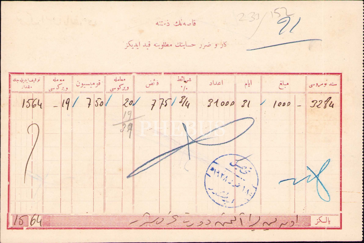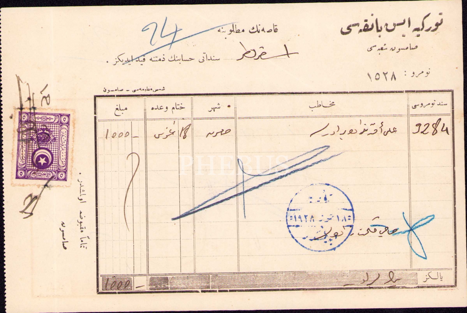 Osmanlıca Türkiye İş Bankası Samsun Şubesi antetli senet, 1928 tarihli, 13x20 cm