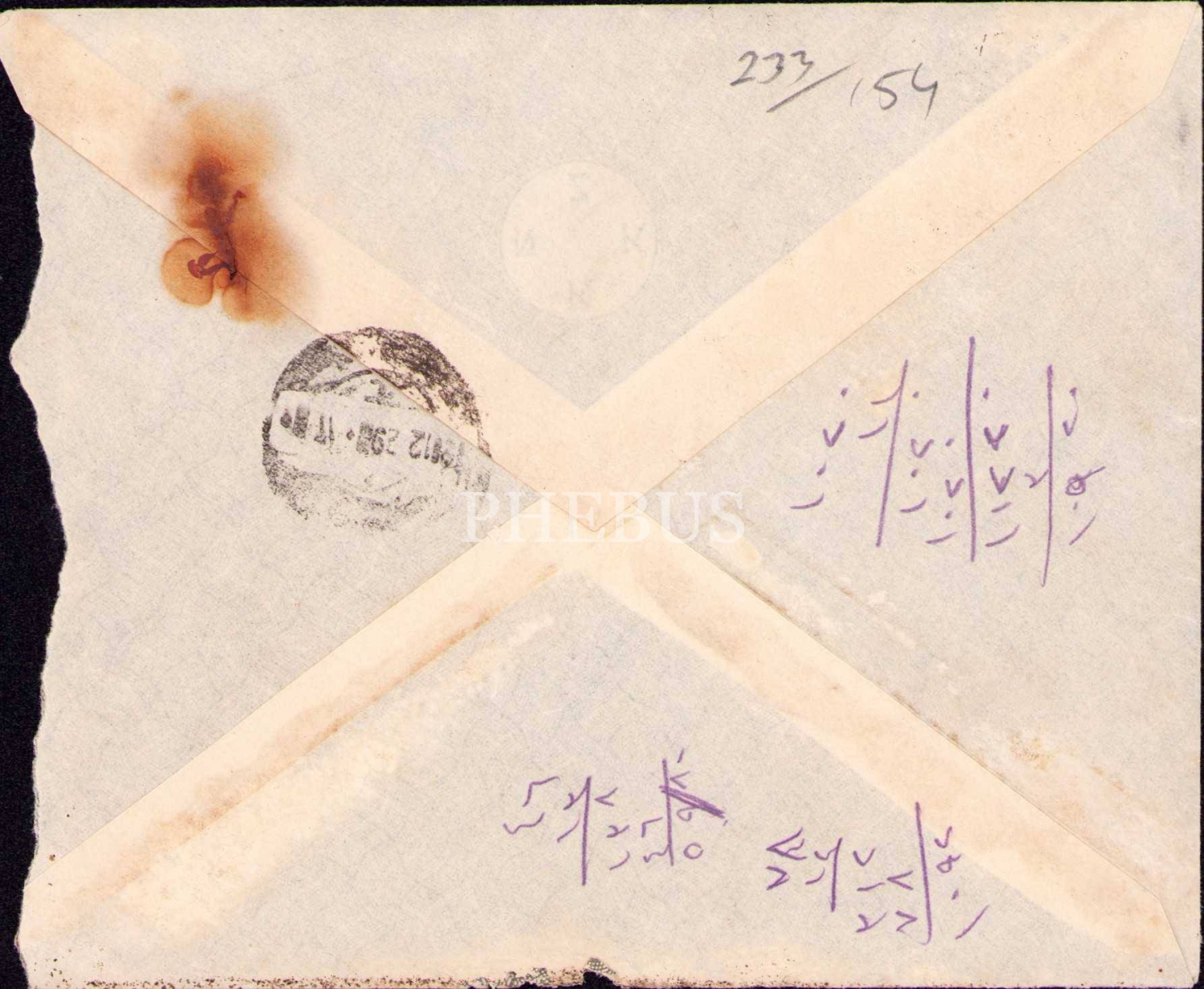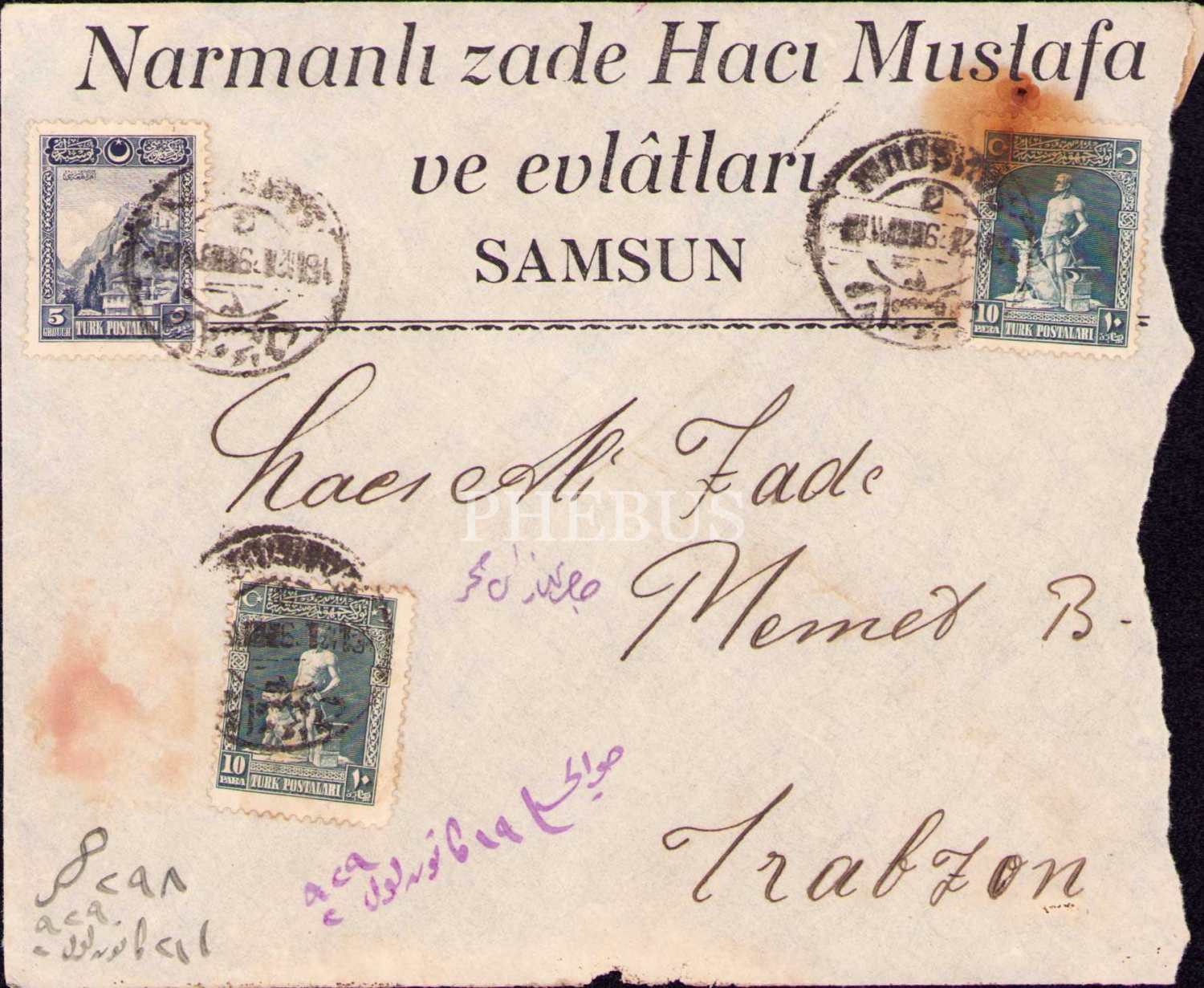 Narmanlı zade Hacı Mustafa ve evlâtları-Samsun antetli zarf, pullu ve mühürlü, 12x15 cm, kenarları yırtık haliyle