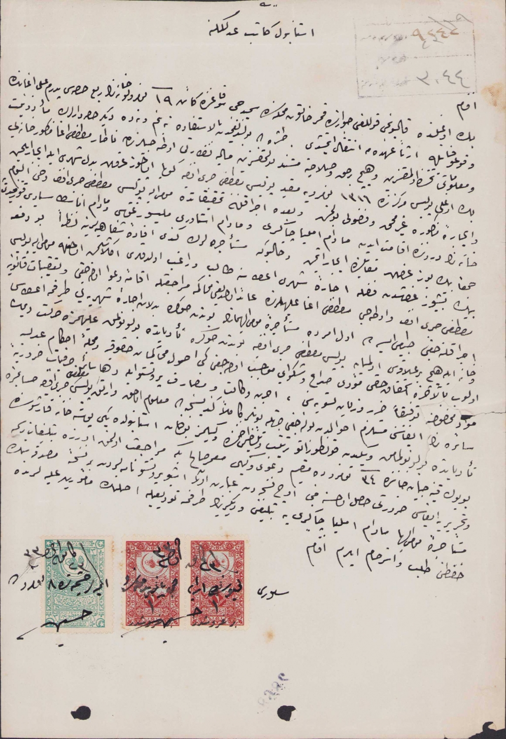 Osmanlı İstanbul Katip adline yazılan evrak, pullu, damgalı, bir kenarı haliyle, 20x28cm
