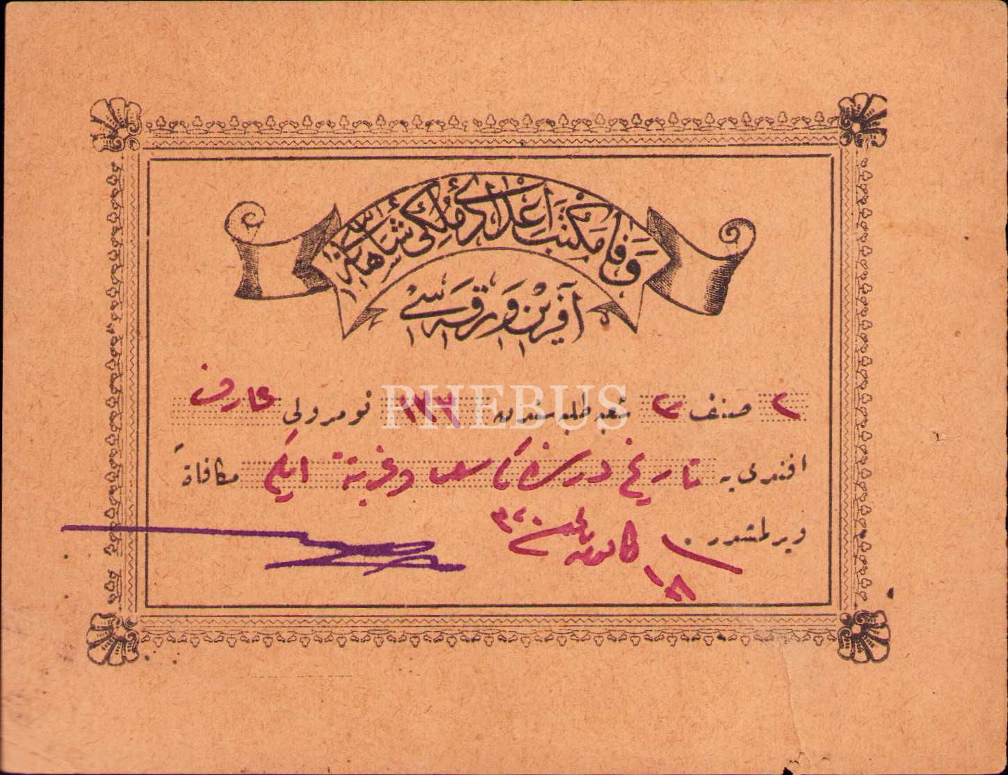 Vefa Mekteb-i İdadi-i Mülkî aferin kağıdı, 1320 tarihli, 9x12 cm