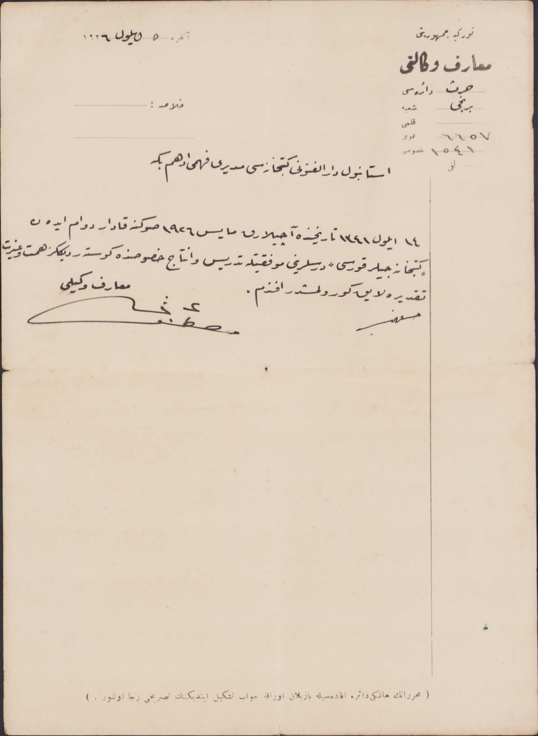 Osmanlı Maarif vekaletinden İstanbul Darülfünun Kütüphanesi Müdürü Fehmi Ethem beye yazılan yazışma, 1926 tarihli,