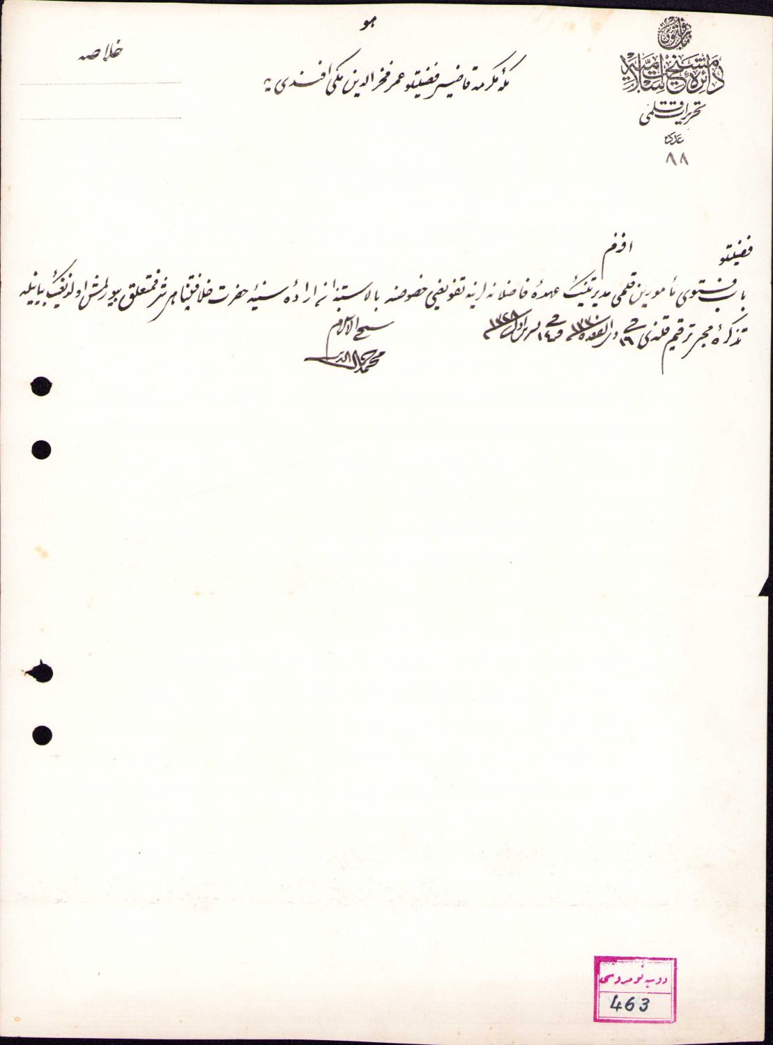 Osmanlıca Dâire-i Meşîhat-ı İslâmiyye antetli ve 1328 tarihli evrak, 21x28 cm