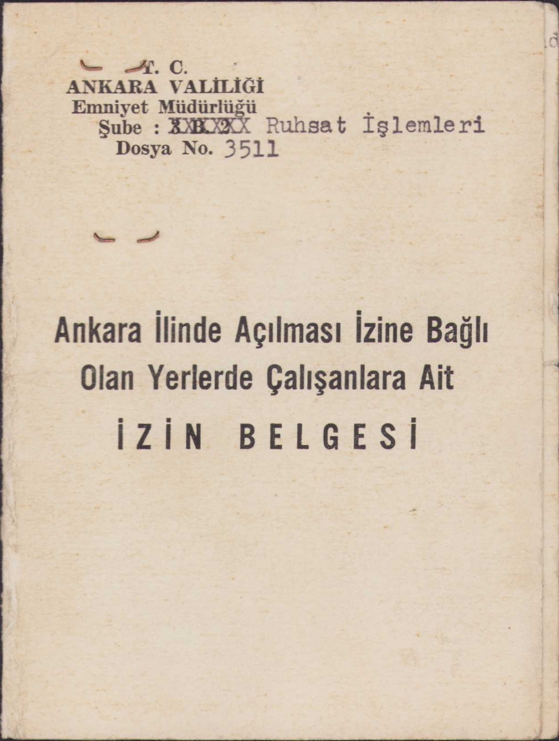 Ankara Valiliği Emniyet Müdürlüğü Ankara İlinde Açılması İzne Bağlı Olan Yerlerde Çalışanlara Ait İzin Belgesi, 1983 tarihli, pullu, mühürlü, 2 yaprak, 10x14cm