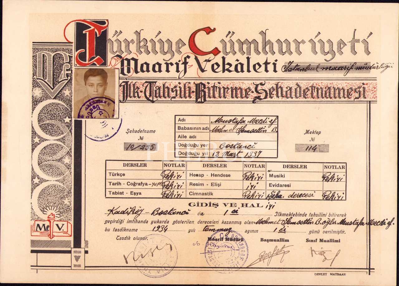 Fotoğraflı ilkokul diploması, Bostancı/Kadıköy 1934, 22x31 cm