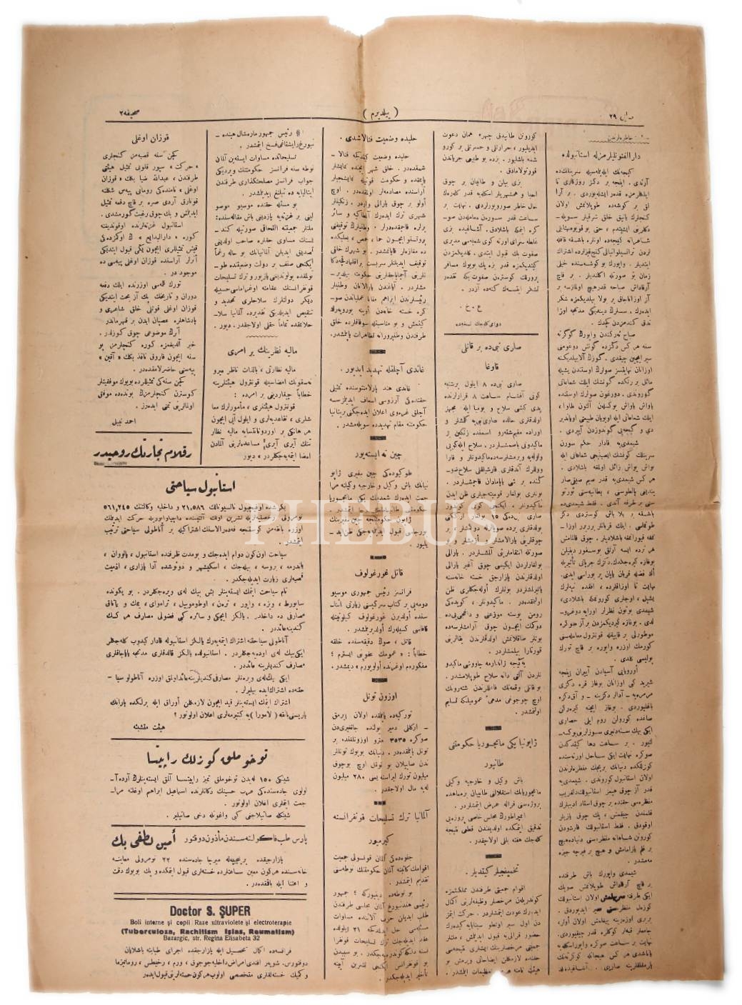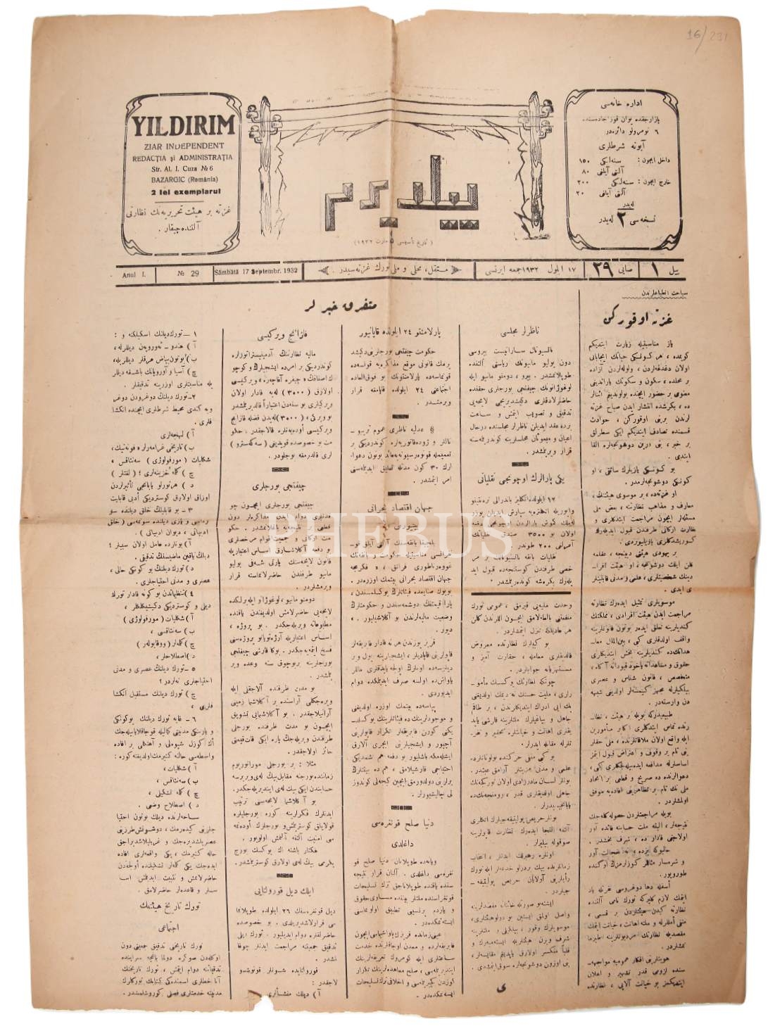 Osmanlıca Yıldırım gazetesi, 17 Eylül 1932, tek sayfa,