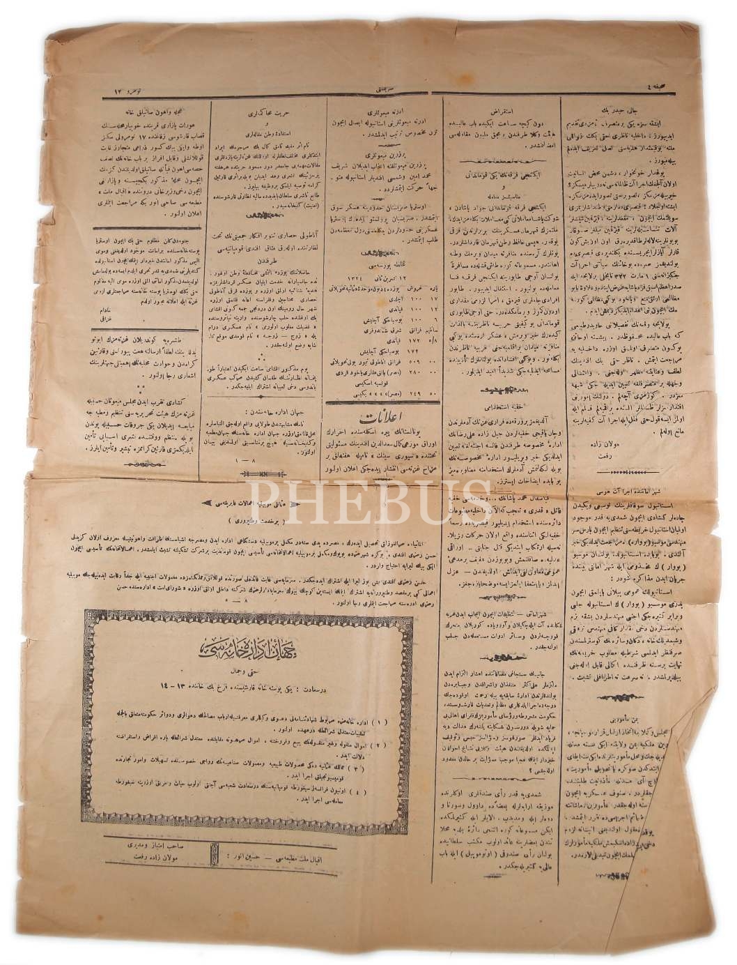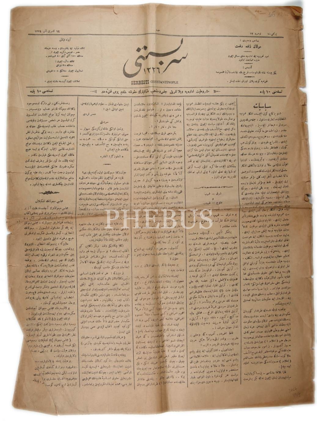 Osmanlıca Serbesti gazetesi, 14 Teşrin-i Evvel 1324, 40x54 cm, yıpranmış haliyle
