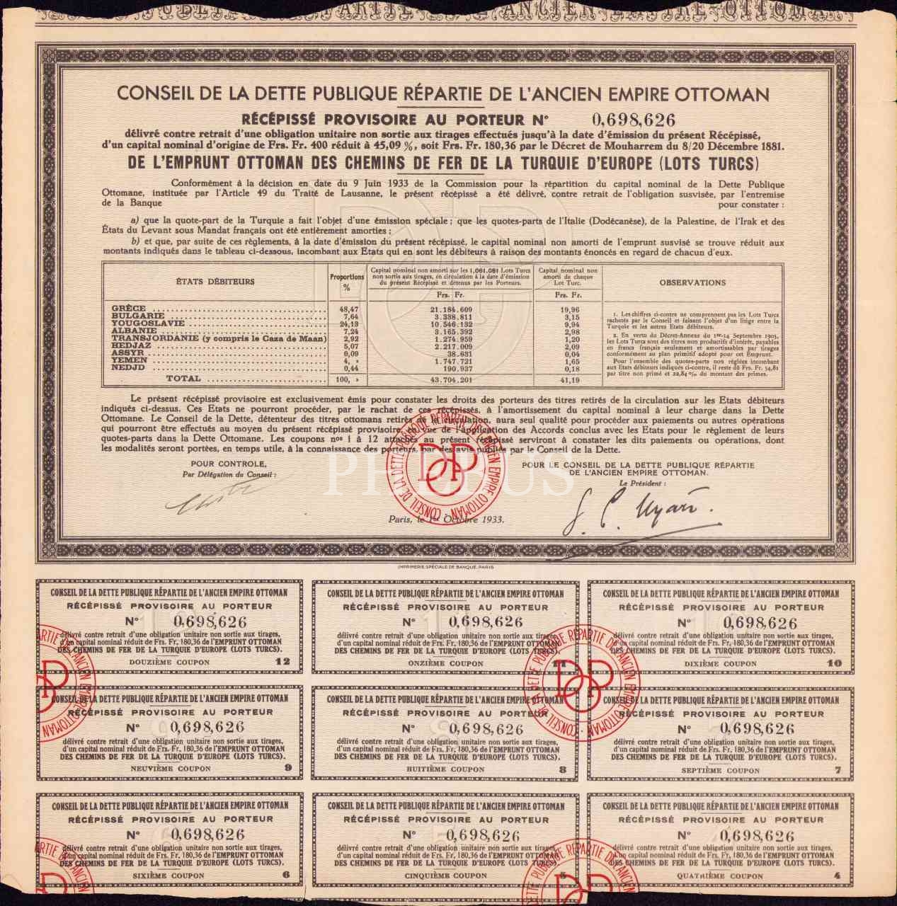 Conseil De La Dette Publique Repartie De L'Ancien Empire Ottoman hisse senedi, 27x27 cm