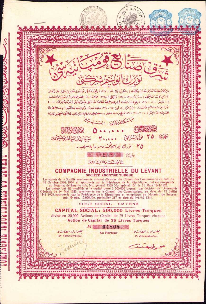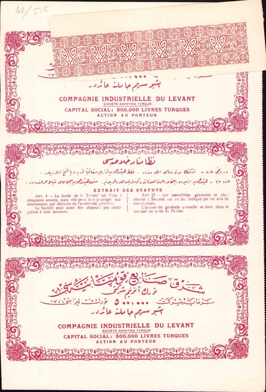 Osmanlıca-Fransızca Şark Sanayi Kumpanyası Türk Anonim Şirketi hisse senedi, 20x29 cm