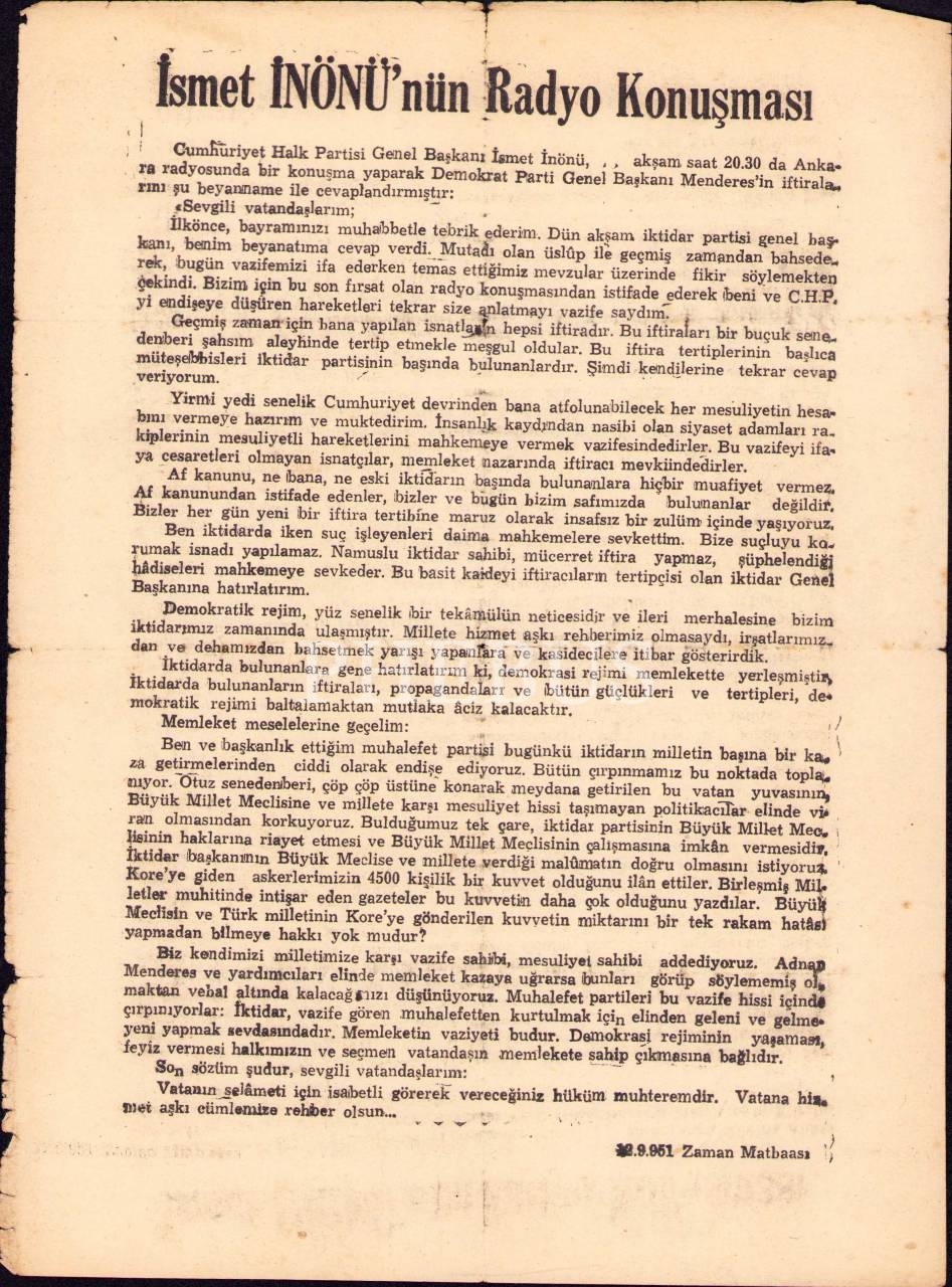 İsmet İnönü'nün Radyo Konuşması, Zaman Matbaası, 1951, 19x27 cm, yorgun haliyle