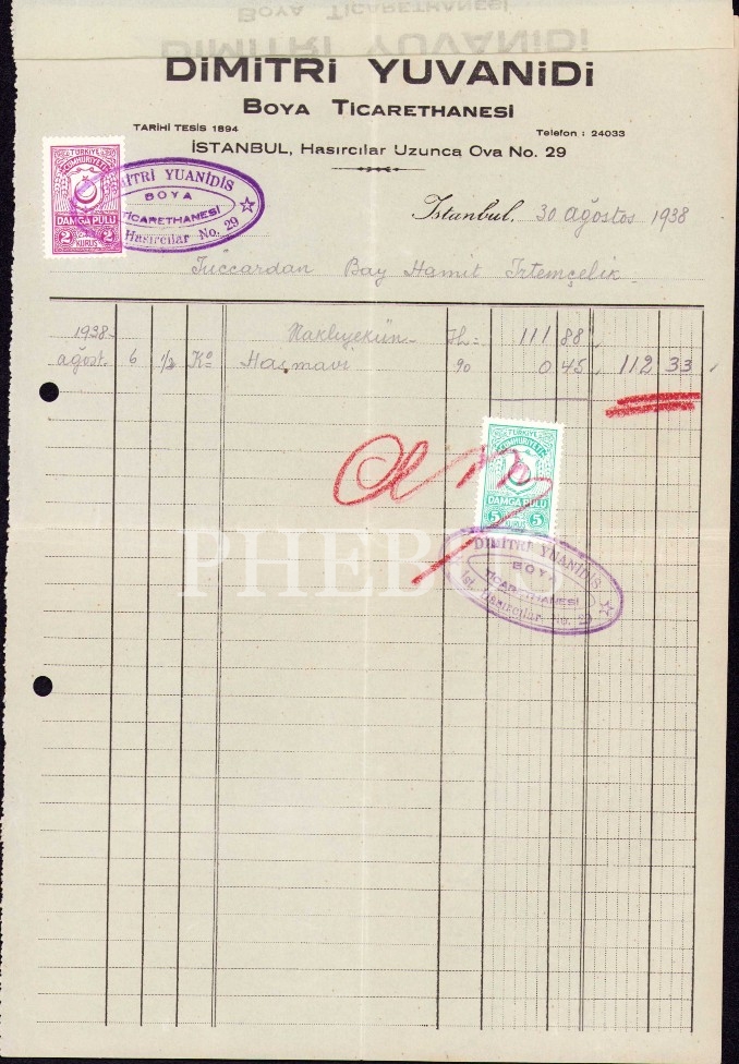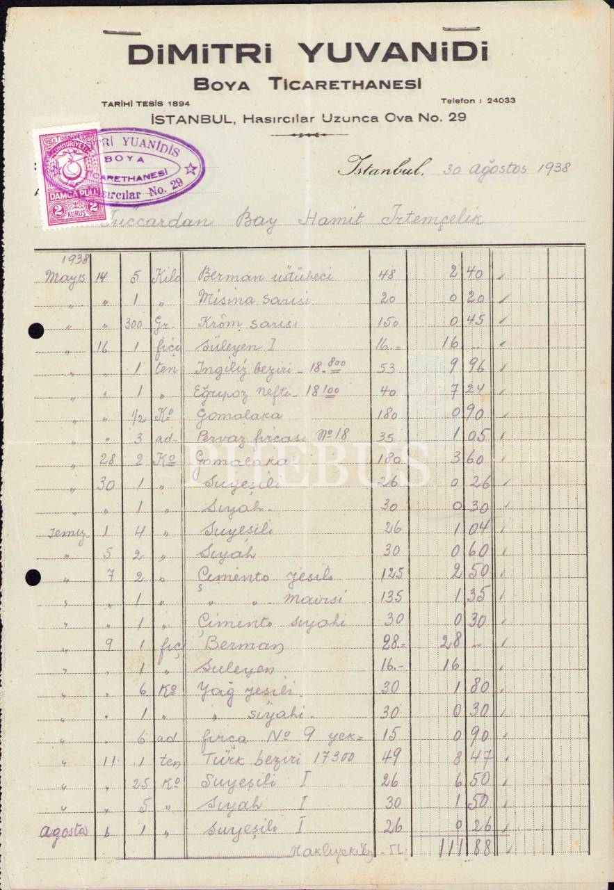 Dimitri Yuvanidi Boya Ticarethanesi antetli fatura, 1938, 20x29 cm