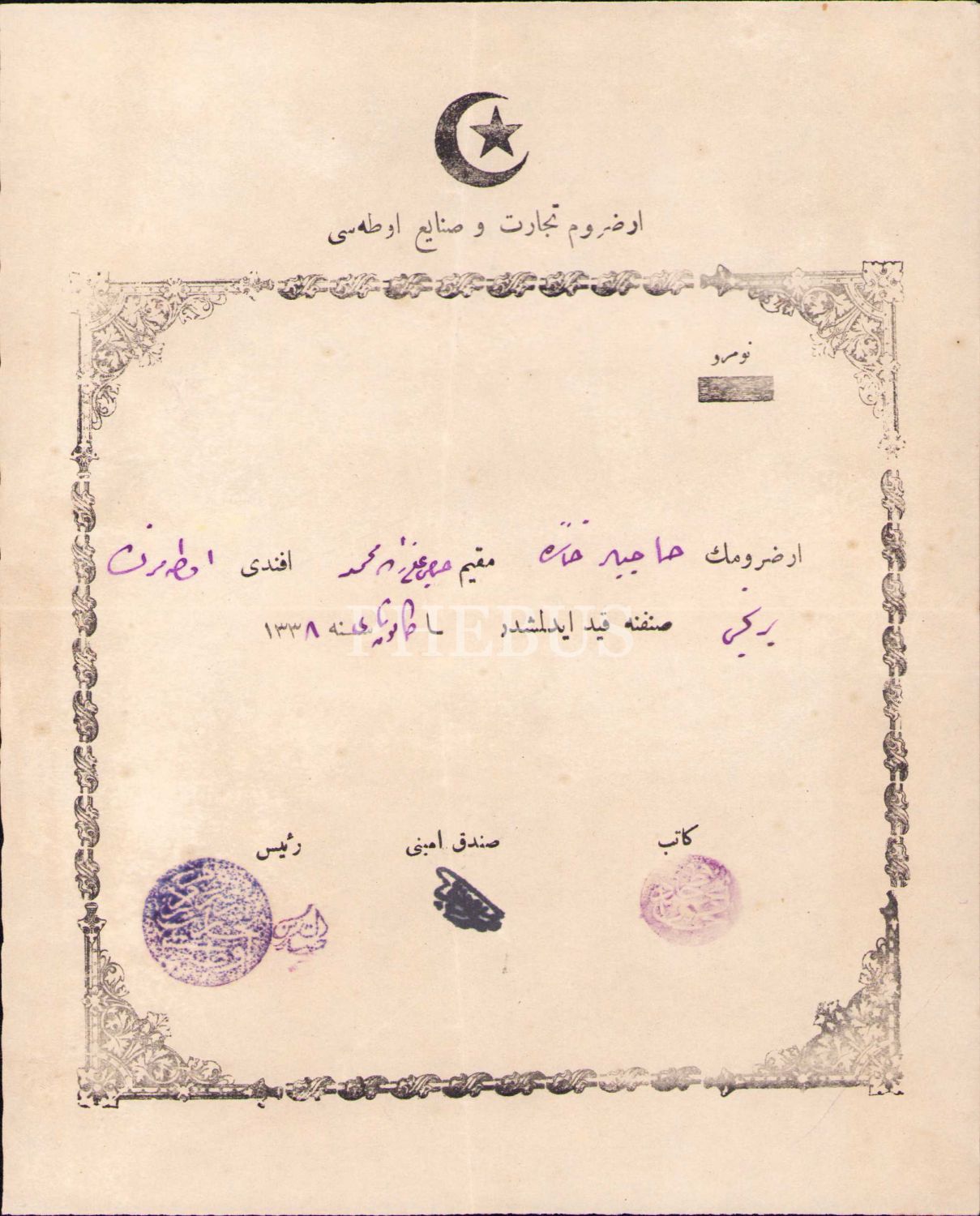 Osmanlıca Erzurum Ticaret ve Sanayi Odası antetli üye kayıt belgesi, 1338, 17x21 cm