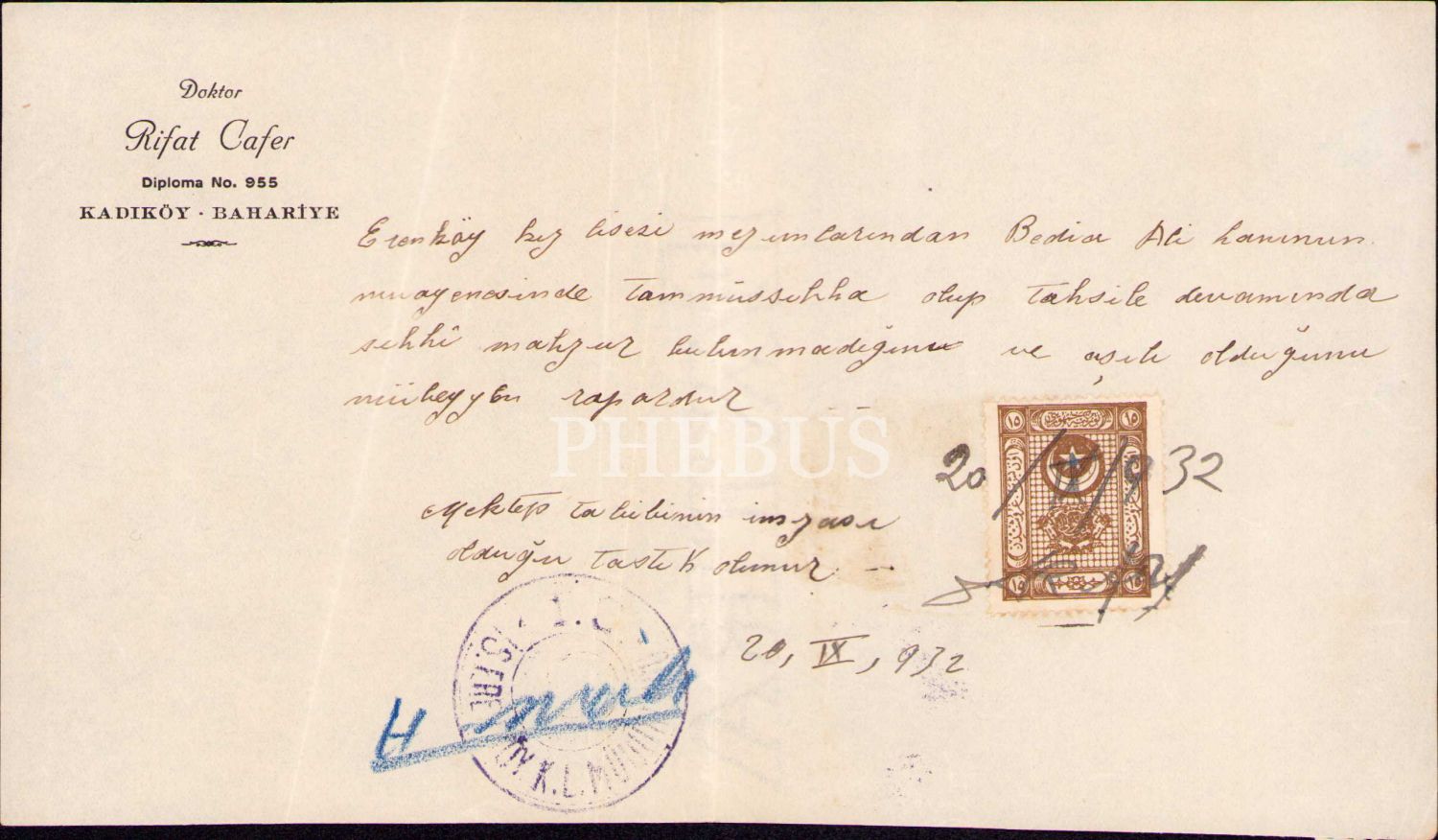 Doktor Rifat Cafer antetli sağlam raporu, 1932, 12x21 cm