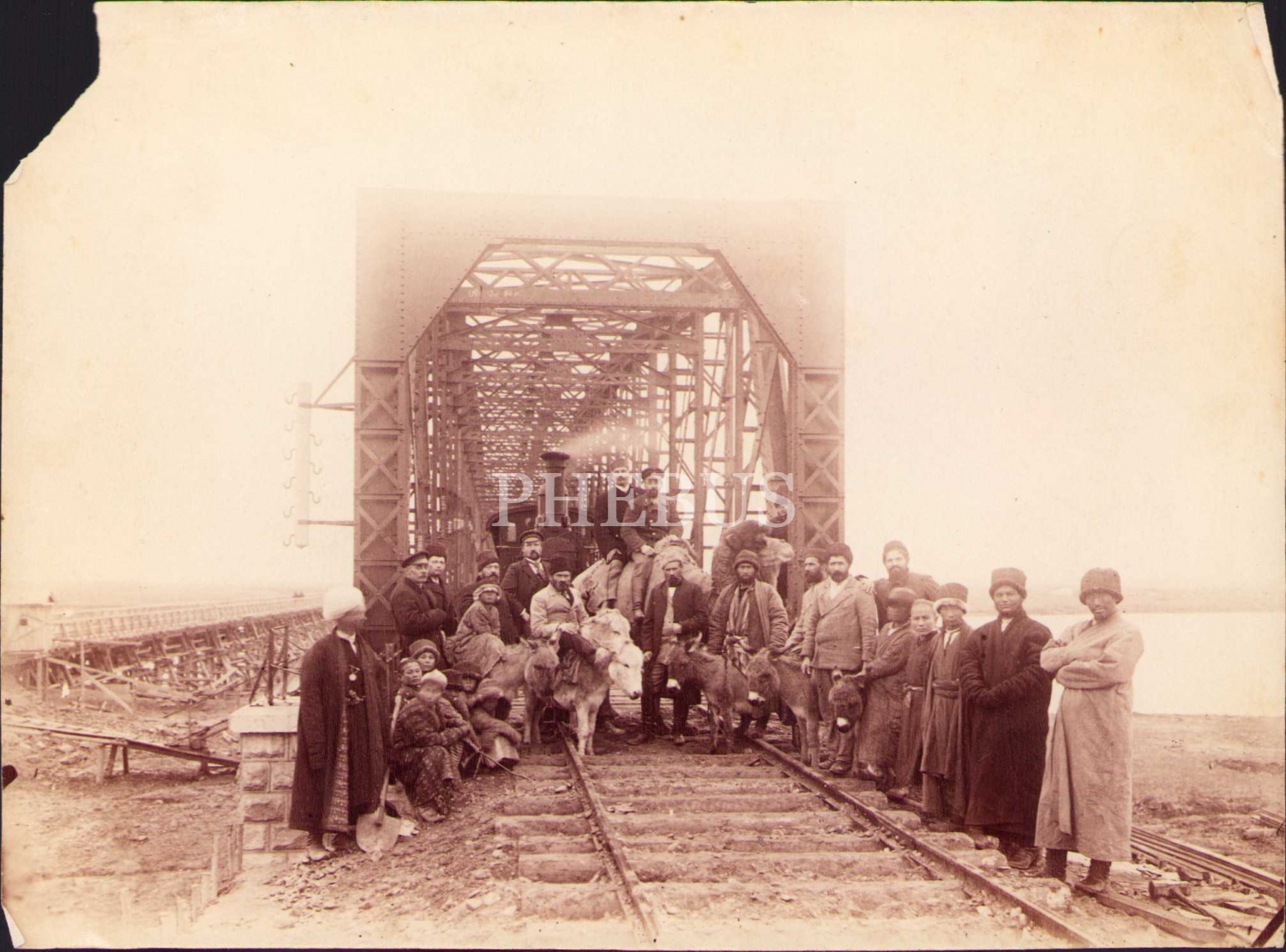 Yöresel kıyafetli kafkas tipler demiryolu üzerinde, albümin print fotoğraf 12x17 cm