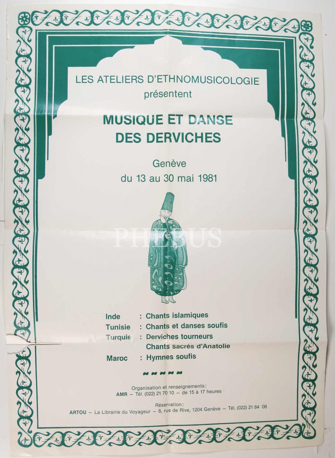 1981'de İsviçre'nin Cenevre Şehrinde İcrâ Edilen Mevlevi Âyin-i Şerifi'nin Büyük Boy Afişi, "Musique et dance des derviches", 1981 tarihli, bir kenarı yırtılmış haliyle, 42x 59 cm