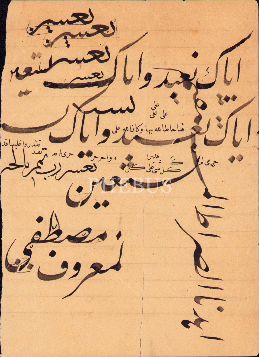 Hattat Halim Özyazıcı Terekesinden Nesih Talik Karalama, sol altta "el-maruf Mustafa" yazılı, ortadan yırtık haliyle,14x19 cm