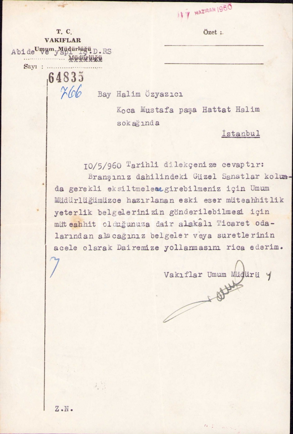 Vakıflar Umum Müdürü Tarafından Hattat Halim Özyazıcı'ya Gönderilen Mektup, 1960 tarihli, Hattat Halim Özyazıcı Terekesinden, 16x23 cm